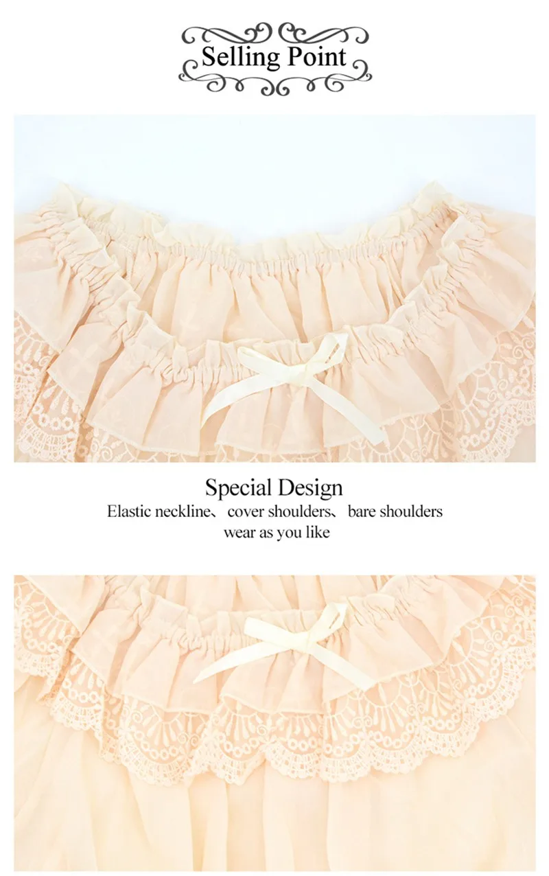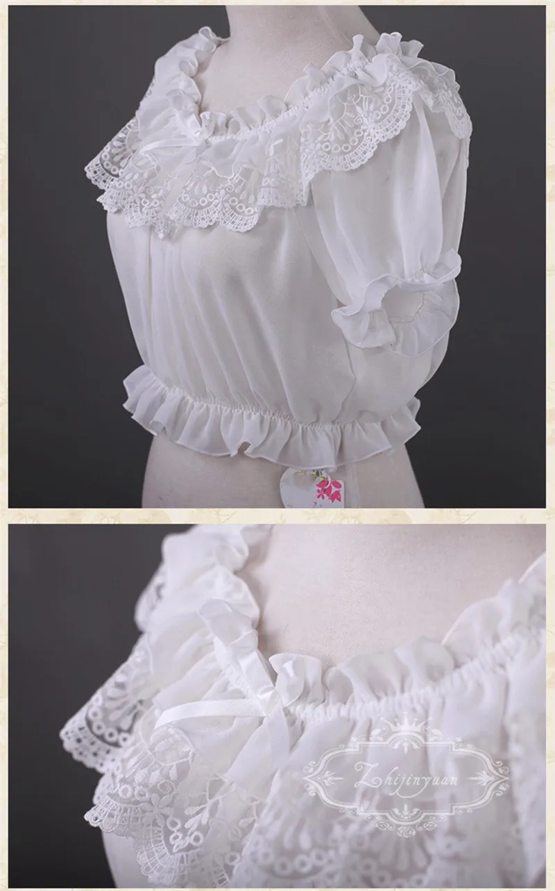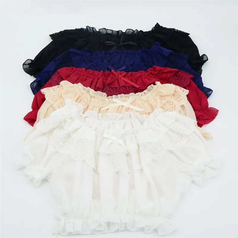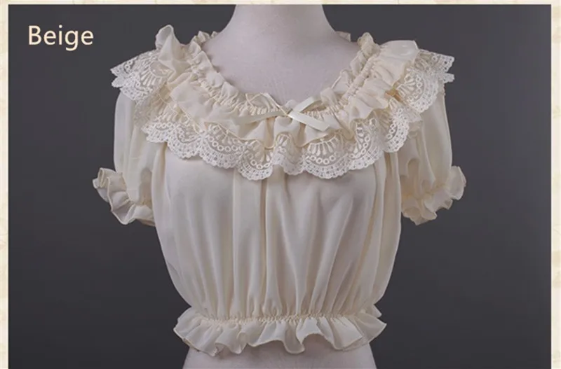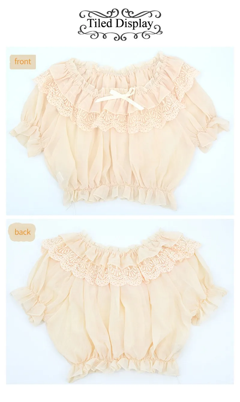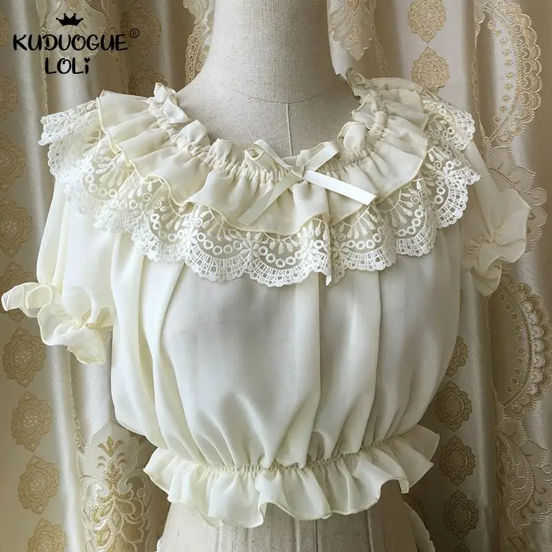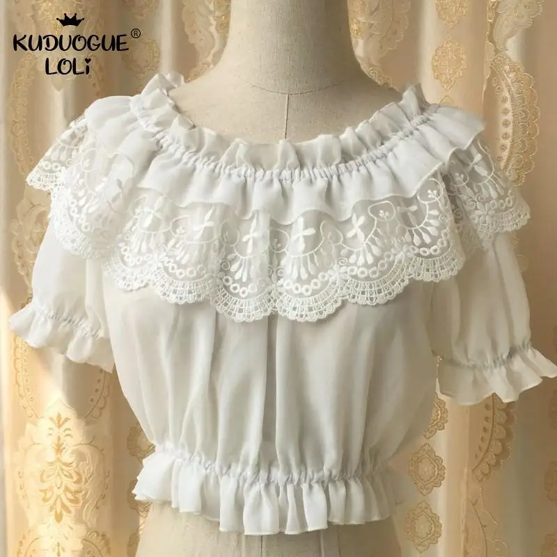Укороченные топы в стиле "Лолита", рубашка для девочек, милая шифоновая блузка с открытыми плечами и коротким рукавом, кружевные оборки, винтажный женский элегантный готический эластичный Топ с бантом