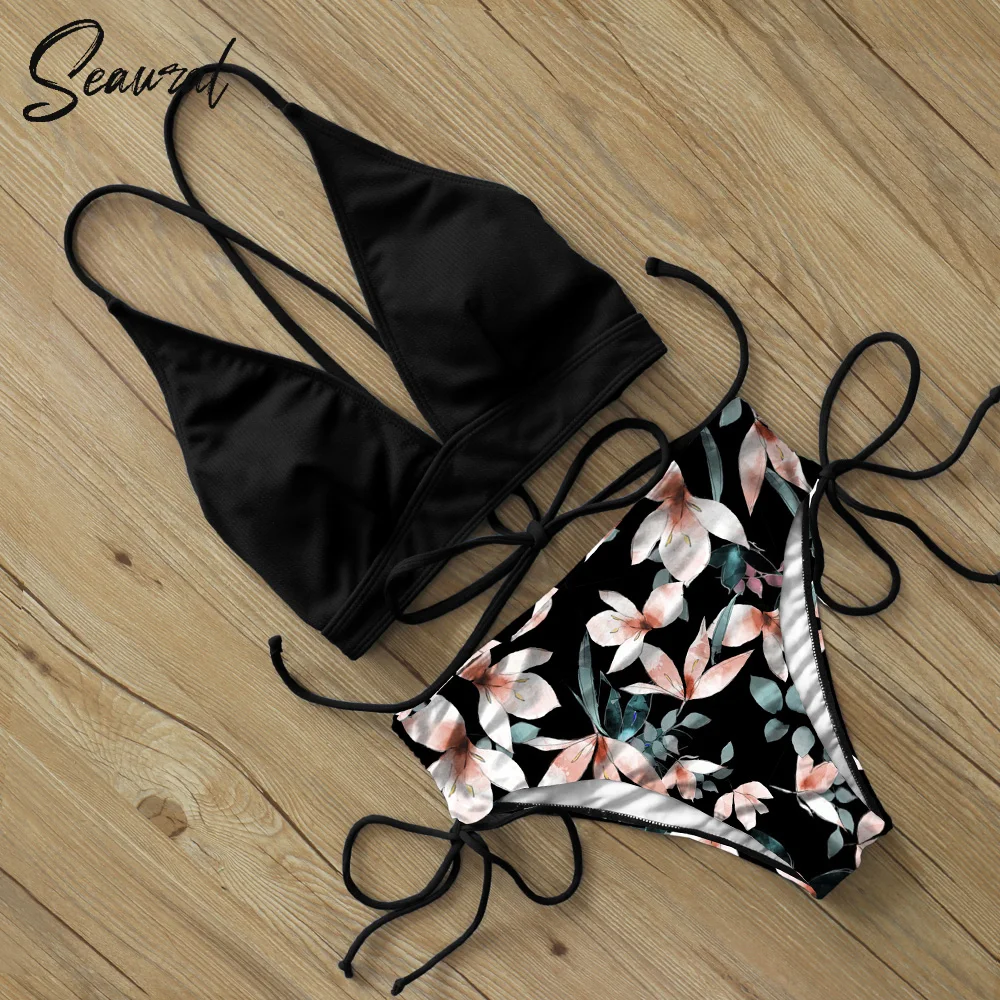 Комплект бикини женский, с принтом листьев, пуш-ап, с высокой талией, пляжный, 2020
