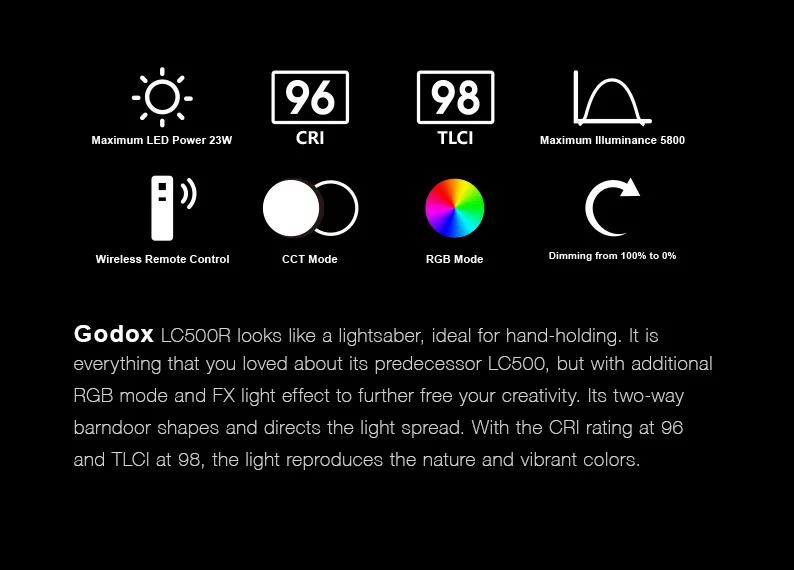 В светильник вес и Универсальный светодиодный RGB светильник палка LC500R от Godox сочетает в себе расширенной непрерывной переменной диапазон цветовой температуры с изменяемым RGB цвет неба в одном, ручной душ палочка. Этот светильник 24,25 "может быть настроен на соответствие условиям окружающей среды, соответствие другим светильникам или только для творческих цветовых эффектов. Светильник интенсивность бесступенчатая (от 0 до 100%), которые необходимы для того, чтобы удовлетворить ваш объект для требования к освещения, а также осветительная панель для телевещания с высоким CRI 96 / TLCI 98 подразумевает цвета и тонизирует кожу сделают с максимальной точностью. В то время как его выход является всенаправленным, он может быть сформирован и направлен с помощью прилагаемых двухсторонних barndoors. Компактный форм-фактор позволяет LC500R помещаться в помещениях другие огни просто слишком велики, и каждый конец имеет 1/4 "-20 разъем для подключения к световым стендам, зажимам, или другое оборудование для захвата. Входящий в комплект 2,4 ГГц беспроводной пульт дистанционного управления обеспечивает доступ ко всем функциям и особенностью LC500R, И предлагает возможность настроить несколько единиц одновременно, индивидуально или в групп, для полного творческого контроля сцены.