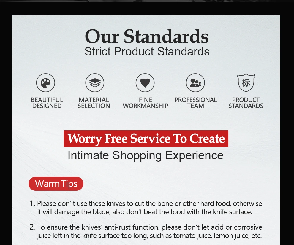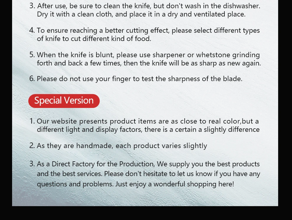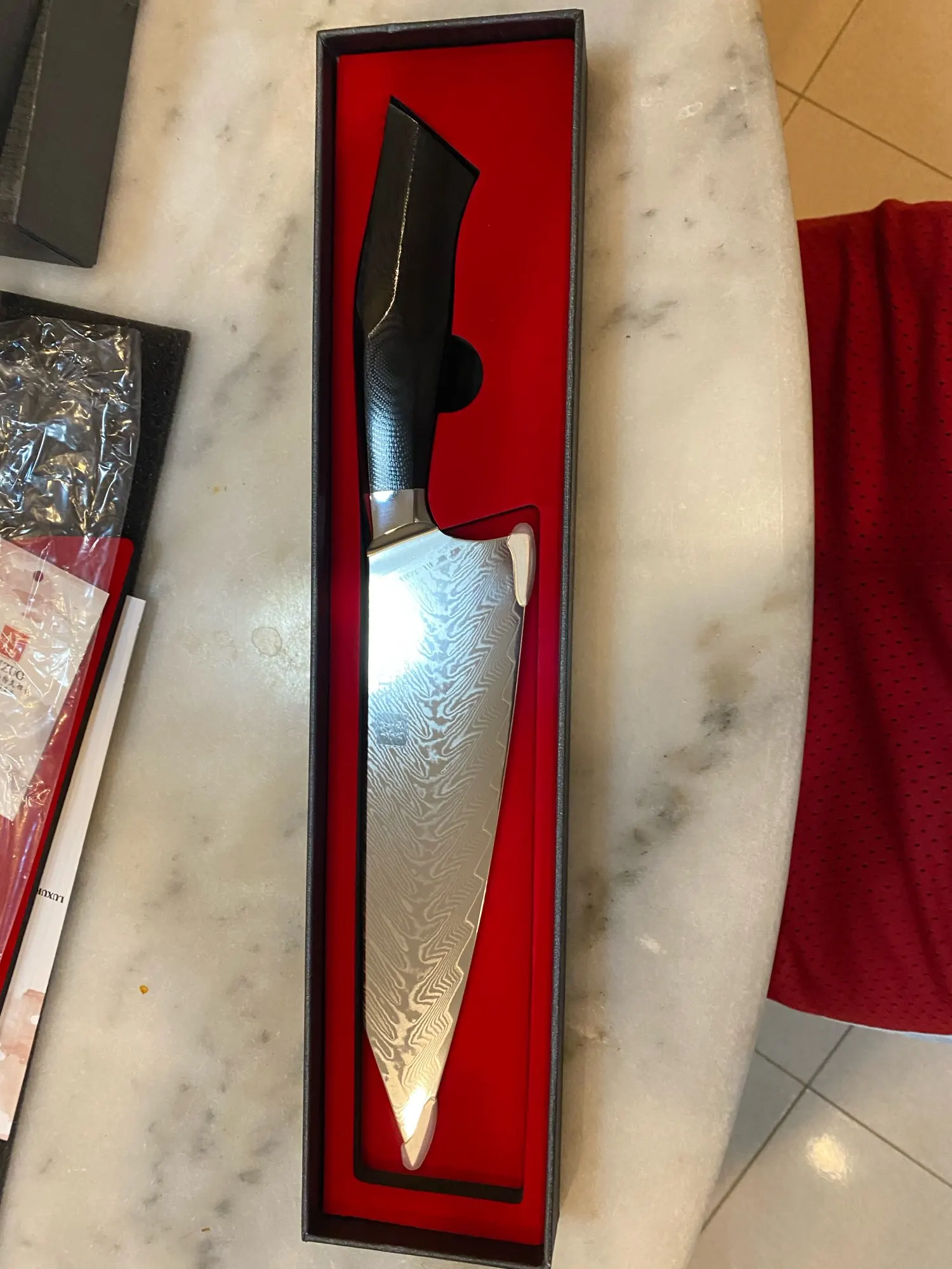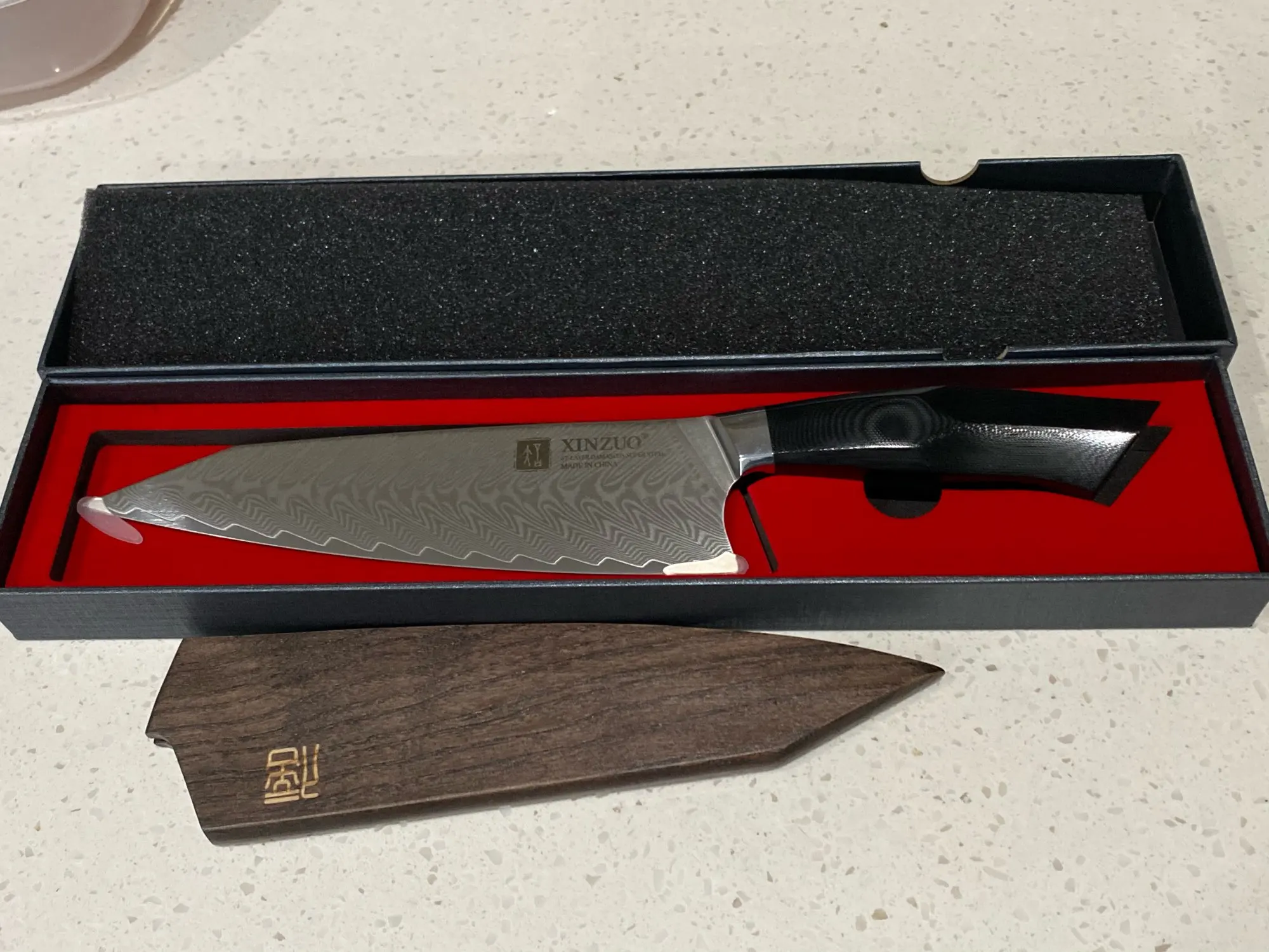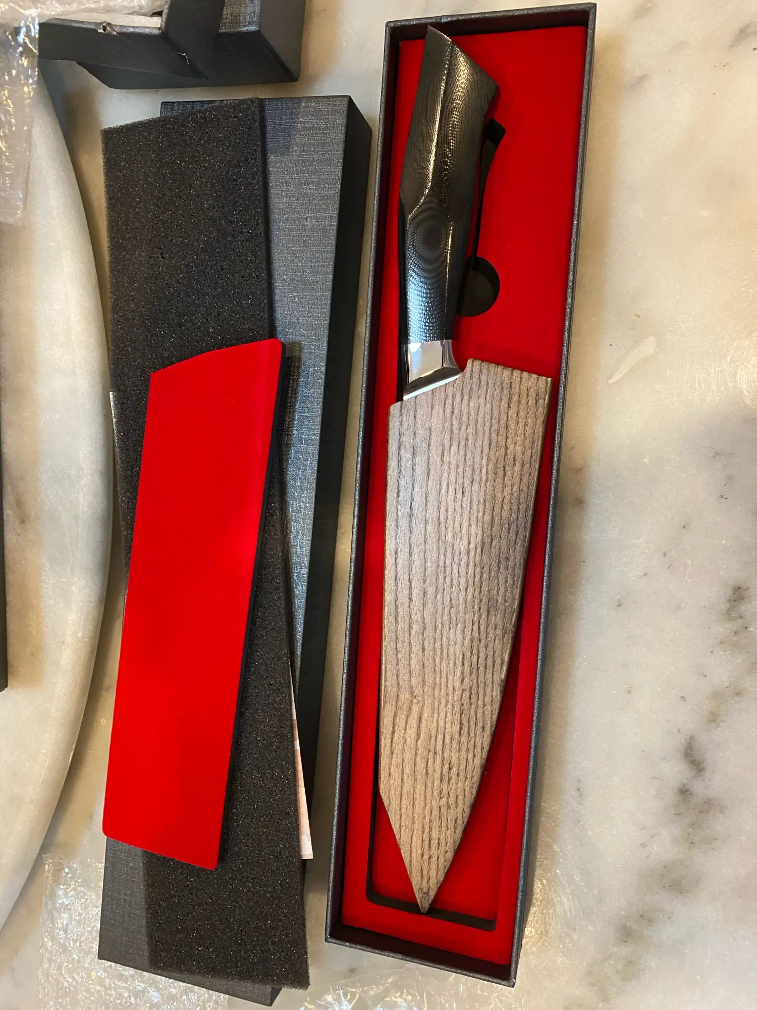 Nice knife. Haven’t used it yet but thought it was a nice solution for traveling with a decent knife. Don’t try putting the wooden sleeve on the other 8.5” knives it’s made just to fit this model perfectly. It’ll scratch the other one up going in and out once. Learned that the hard way. Will update on quality when I get a chance to use it but the other set I have is quite sharp. The seller is super trustworthy and responsive to all inquiries, I’ll keep buying to replace all my knives at home as long as the knives last more than a year.