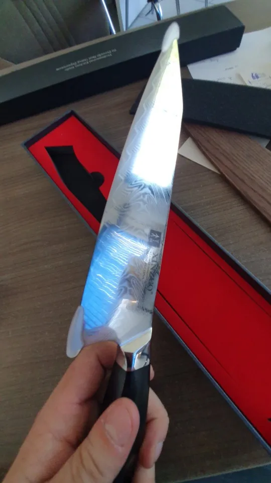 Нож, как описал продавец, красивый дамасский нож, очень острый, ручка немного тяжелая и гладкая, но не заметная. Быстрая доставка. Я рекомендую