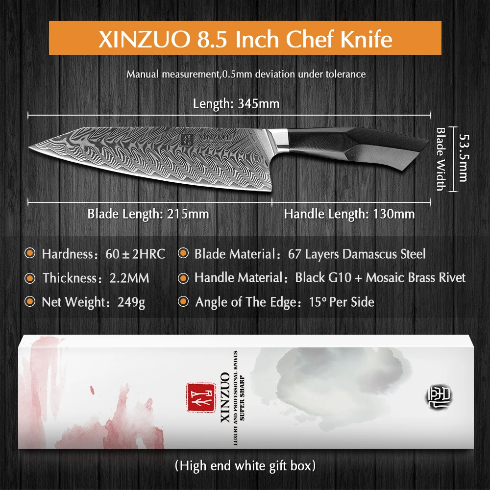Нож шеф-повара XINZUO, 8,5 дюйма, из дамасской стали, для овощей, мяса, G10 +, из латуни, заклепочная рукоять