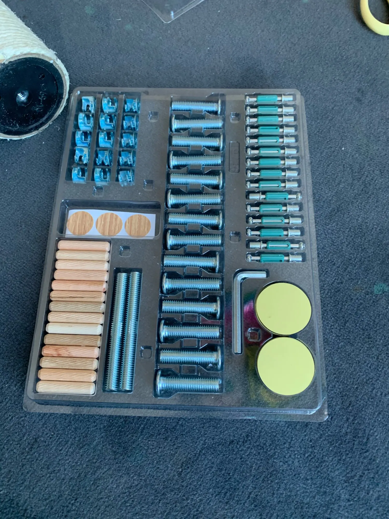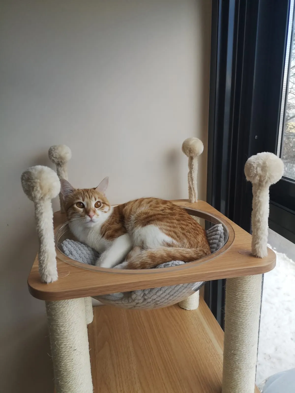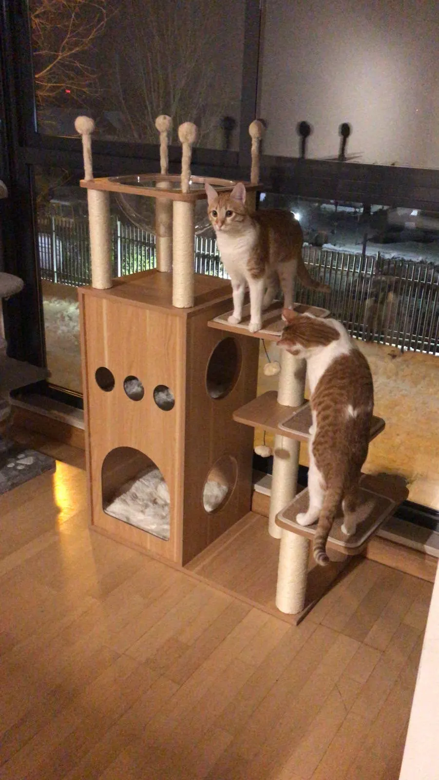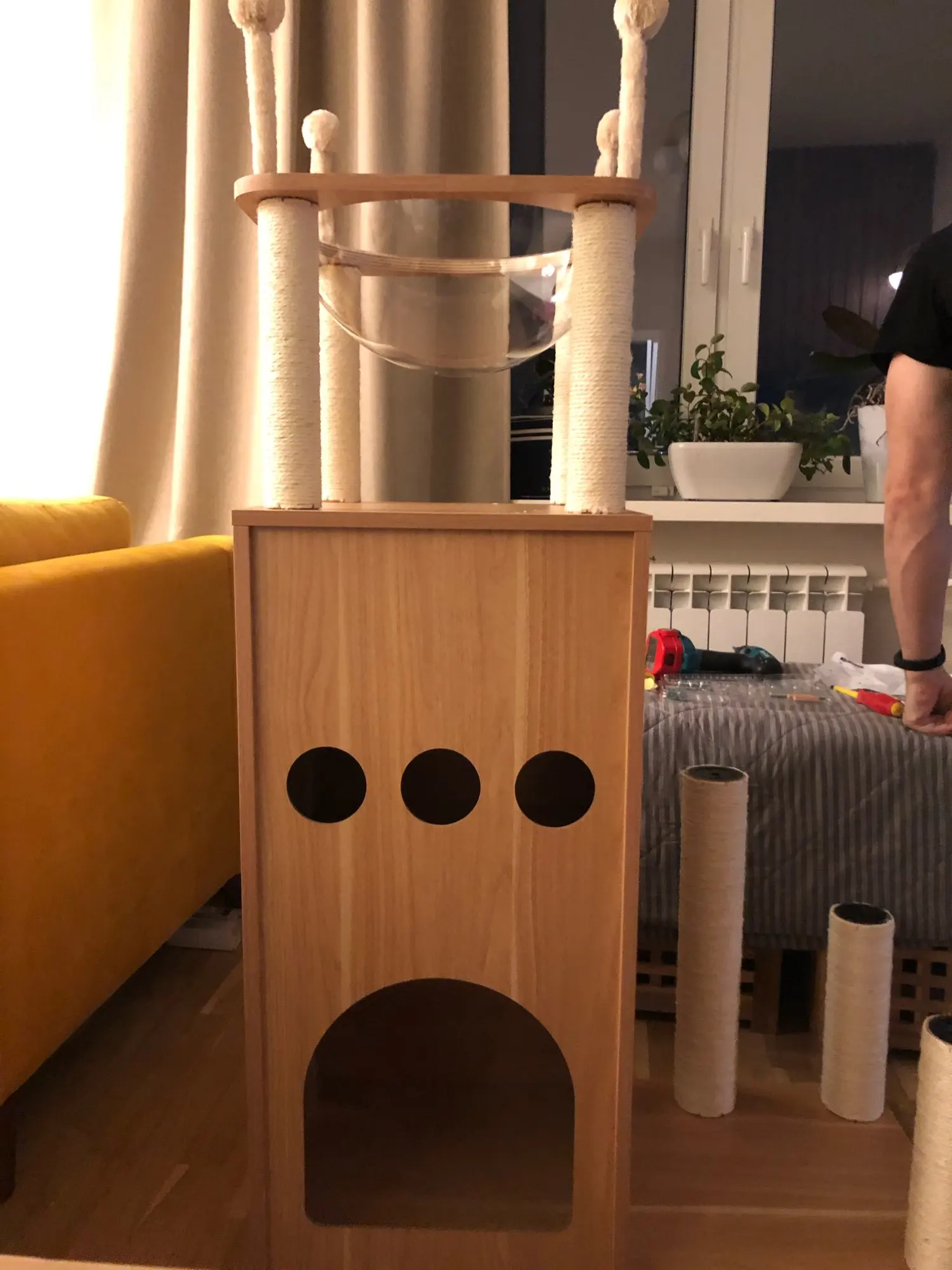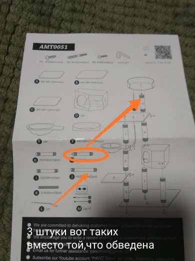 домик понравился, единственное-вместо верхней когтеточки положили такую же,как две нижних,что привело бы к невозможности установить верхушку.Повезло,что дома нашёлся нужный похожий"винт".