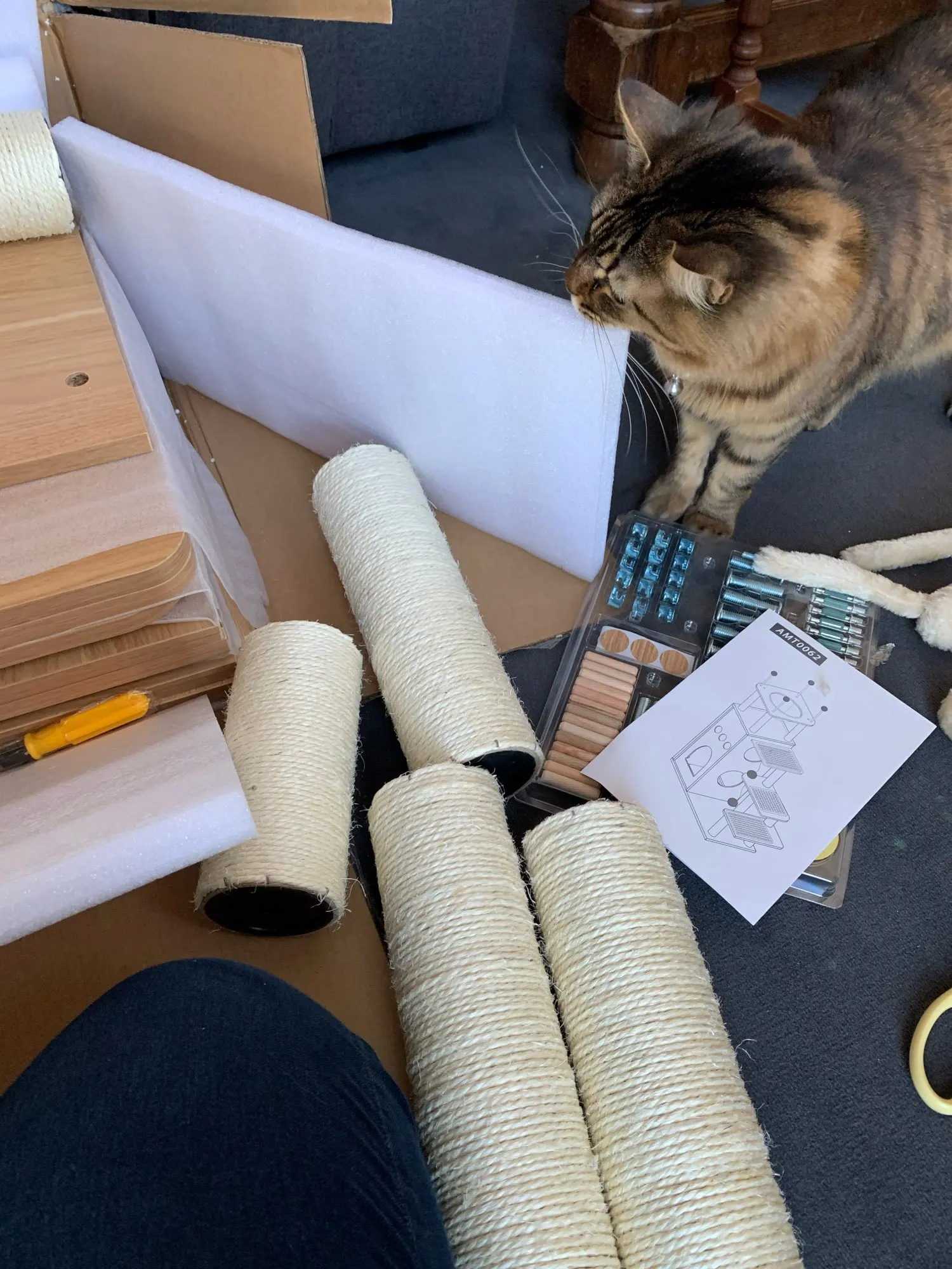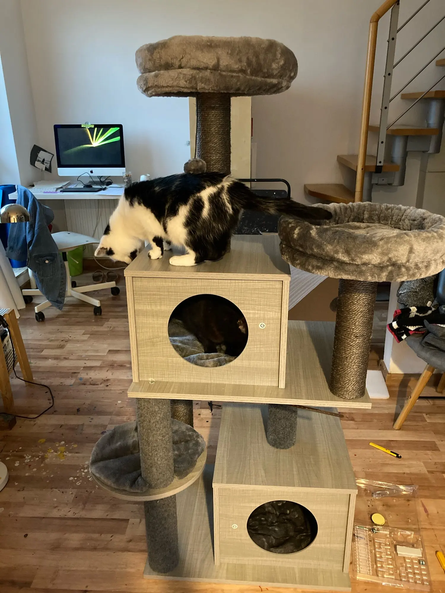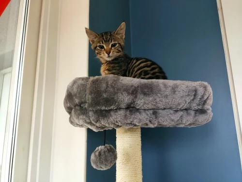 ceci est un super arbre à chat,solide,douillet et très ludique.montage facile.le colis est arrivé très vite,emballage impeccable .tout est livré tournevis et clef..... un grand merci