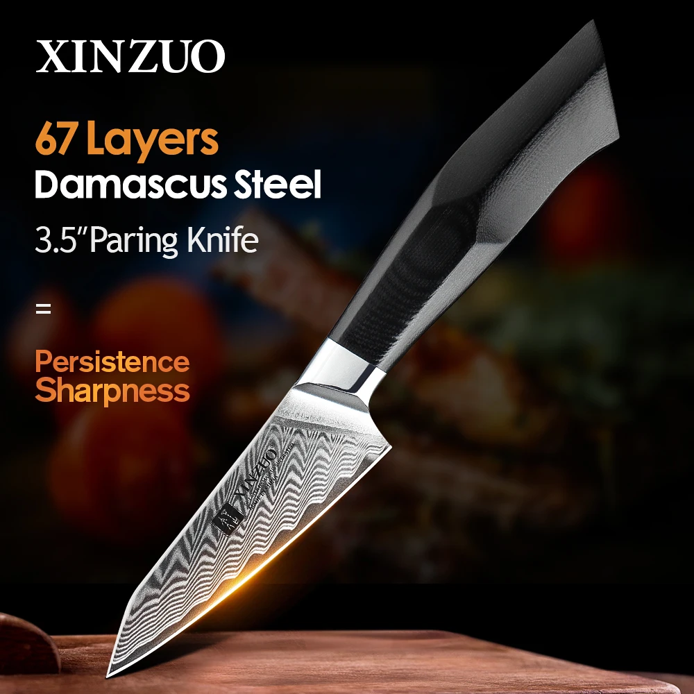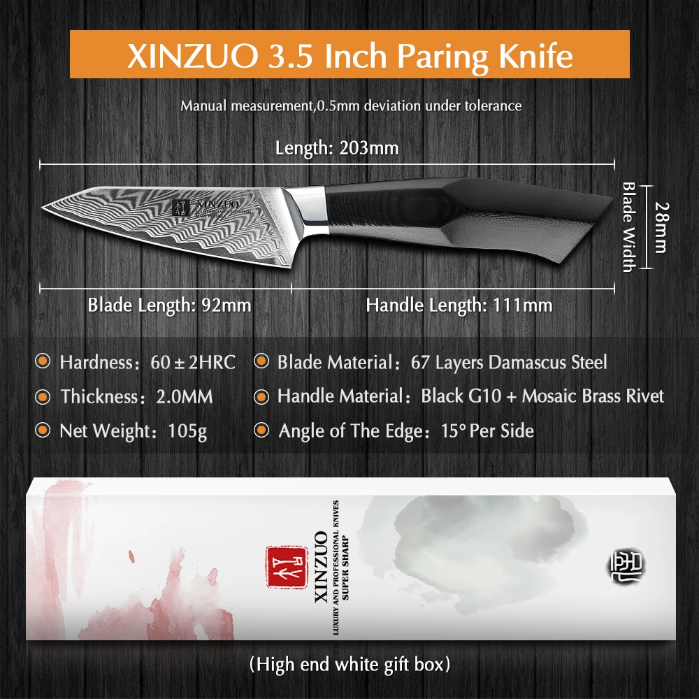 XINZUO 3,5 ''нож для чистки овощей, лезвие из дамасской стали VG10, острый бритвенный станок G10, мозаичные латунные зеркальные кухонные ножи, пилинг фруктов