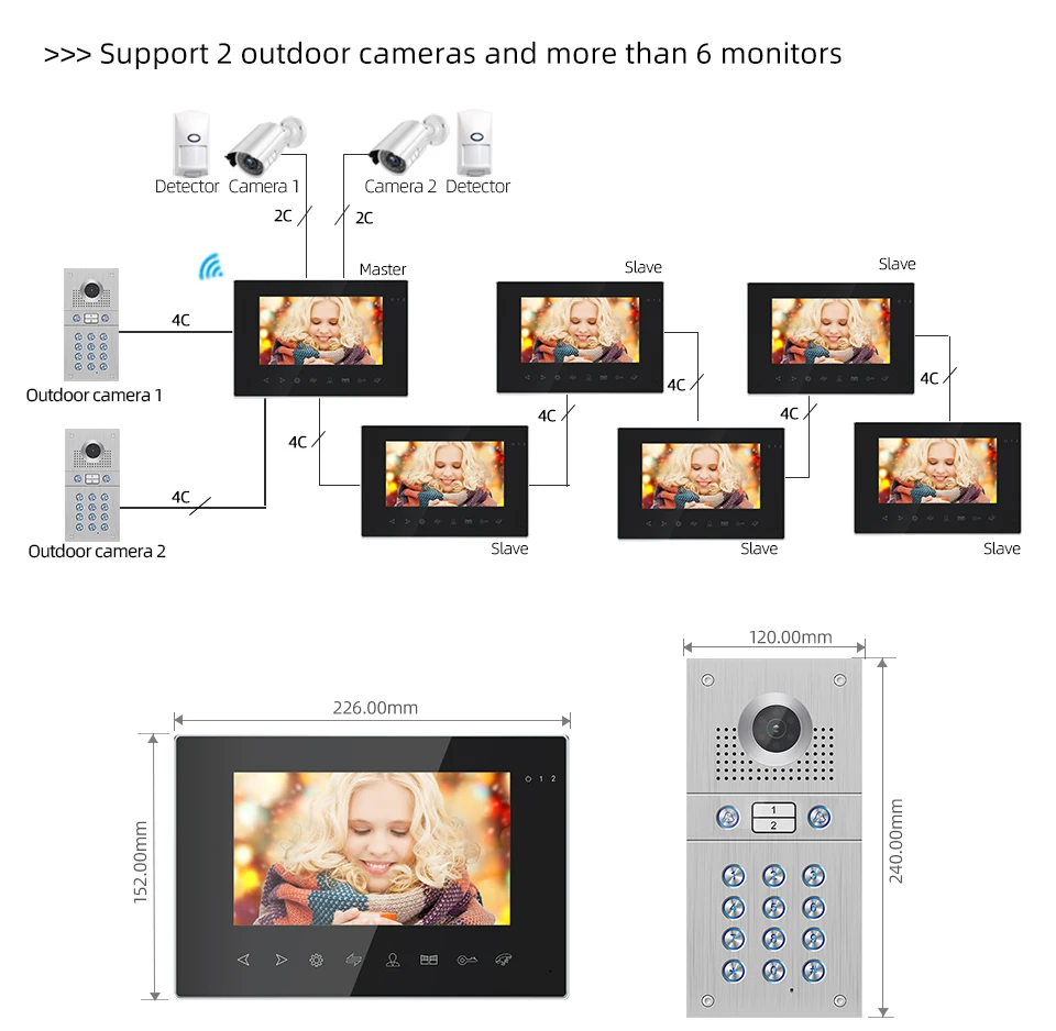 Поддержка монитора для подключения 5 внутренних мониторов, 2 замков, 2 панели вызова и 2 камеры наблюдения в основном, этот товар является бесплатным и доступен для двусторонней связи. Он поддерживает связь между внутренним монитором и наружной камерой, но также поддерживает связь между монитором и монитором. Вы не всегда спустились вниз, откройте дверь после установки нескольких домофонов