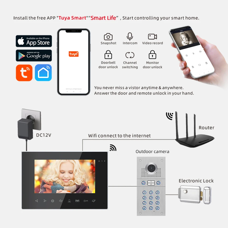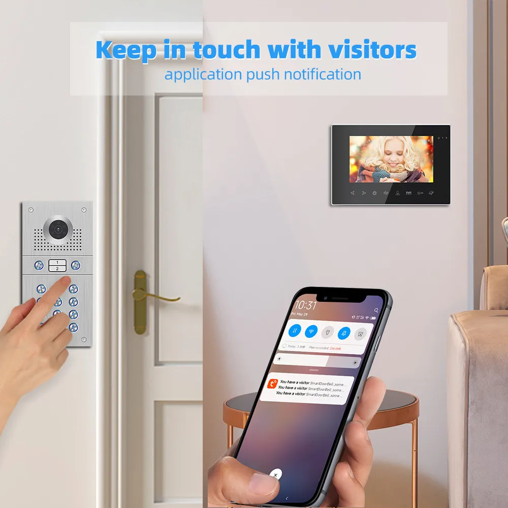 ♦Поддержка смартфона iOS и Android с помощью приложения Tuya smart.♦Цифровая система, 4 провода кабельного подключения.♦2-полосная связи между внутреннего и наружного блока. Поддержка 2 способ связи между мониторами.♦1.3MP камера, широкий угол обзора.♦Когда кто-то звонит на улице, ваш монитор и смартфон будут звонить одновременно.♦Голосовое сообщение и обнаружение движения, поддерживаемая домашняя система сигнализации, может добавить 8 зон безопасности сигнализации (например: датчик дыма, газовый датчик, датчик PIR... и т. Д.)♦WIFI включен или проводной маршрутизатор.
