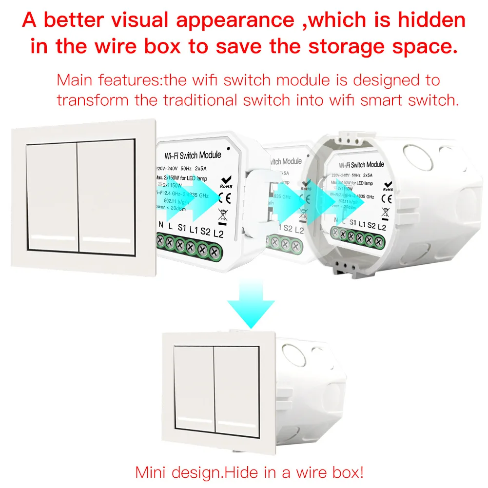 Переключатель Wi-Fi 2 way 1. Маленький размер, скрытый в коробке переключения 2. Традиционный переключатель и умный переключатель работают независимо, Не мешают друг другу 3. Используется для двойного переключателя управления, Два переключателя управляют одной и той же лампой 4. Может управлять двухканальным переключателем Основные функции: 1. Легко заменить традиционный переключатель, чтобы сделать вашу жизнь умнее. Для того, чтобы сделать вашу 2-полосная двойной контроль переключатель умнее, вам нужно только установить одно такое умный переключатель, который подходит для ЕС/Великобритания коробка переключателя. Пожалуйста, подтвердите размер перед заказом. 2. Управляйте огнями или устройствами по беспроводному каналу через голос или используйте смартфон и Alexa или Google Assistant. 3. Максимальная нагрузка на напряжение модуля переключателя составляет 220-250 Вольт, который может управлять различными видами ламп и приборов. 4. Предоставляем модуль переключения сетевого подключения 2,4G через мобильный телефон без концентратора. 5. Приложение Smart life или граффити 6. Обеспечивает идеальную интеллектуальную трансформацию для вашего оборудования. Вам нужно только подключить этот умный модуль к вашему устройству и источнику питания, и большинство совместимых продуктов могут быть преобразованы в смарт-устройства.