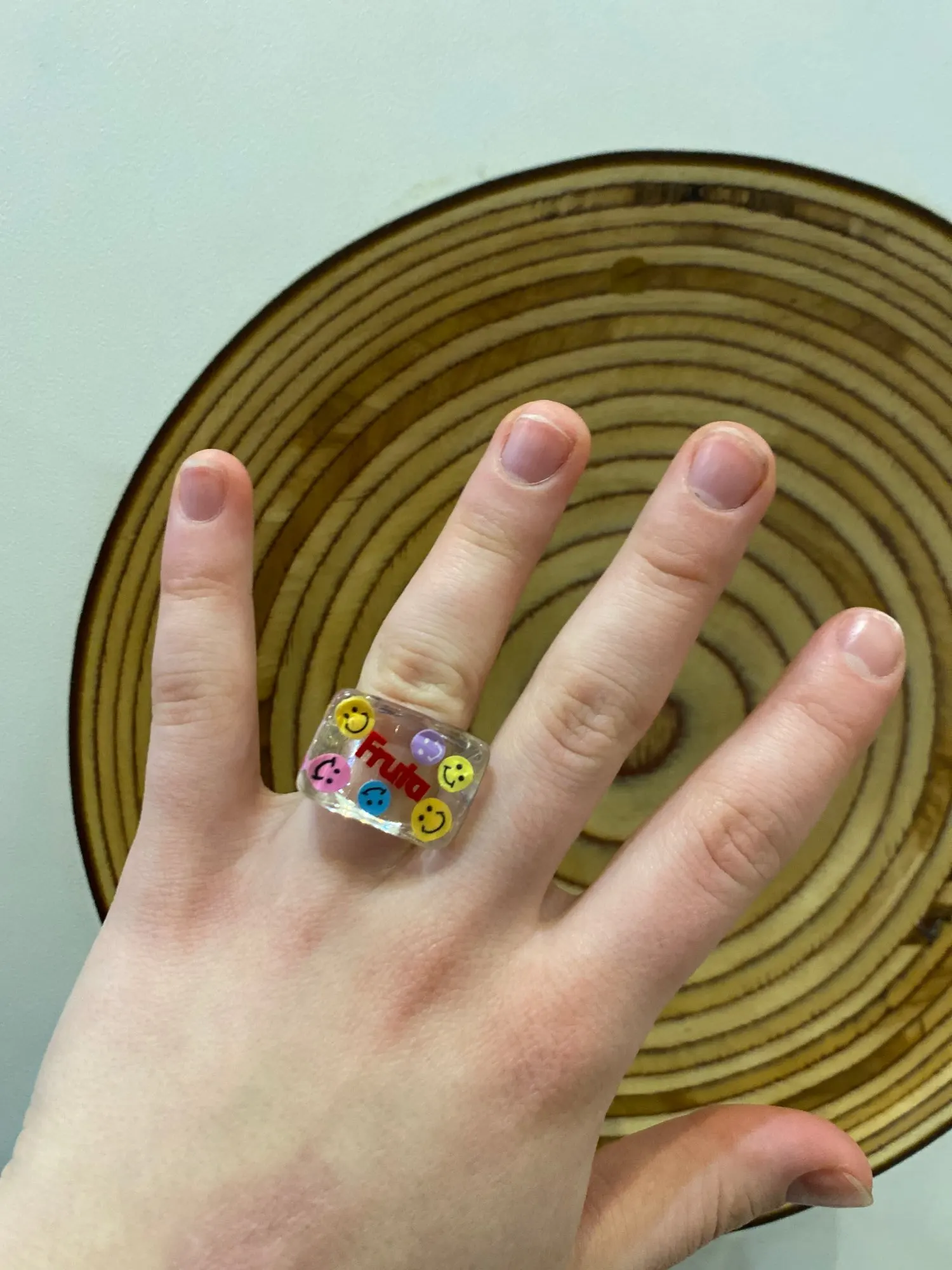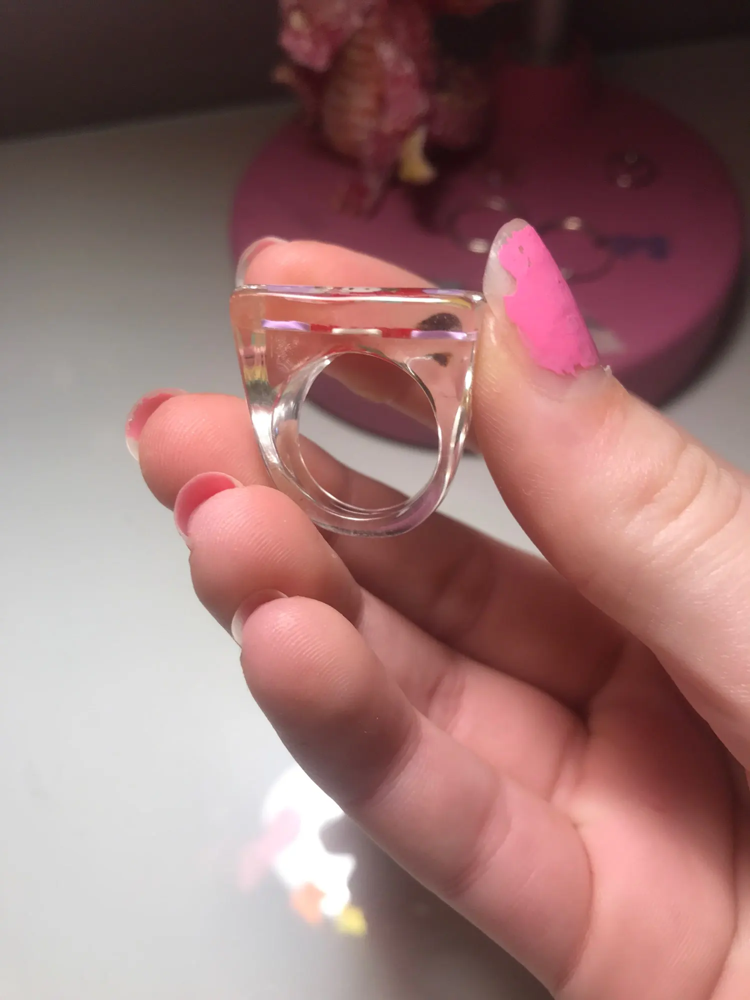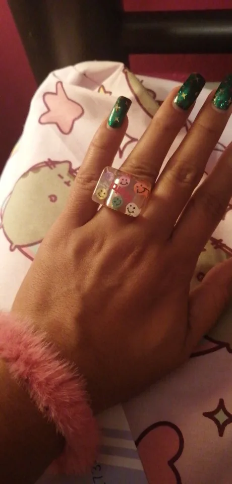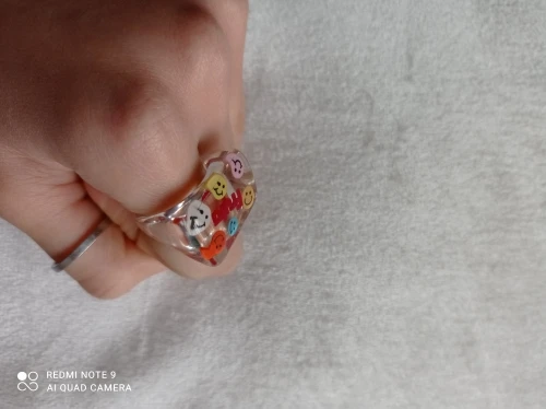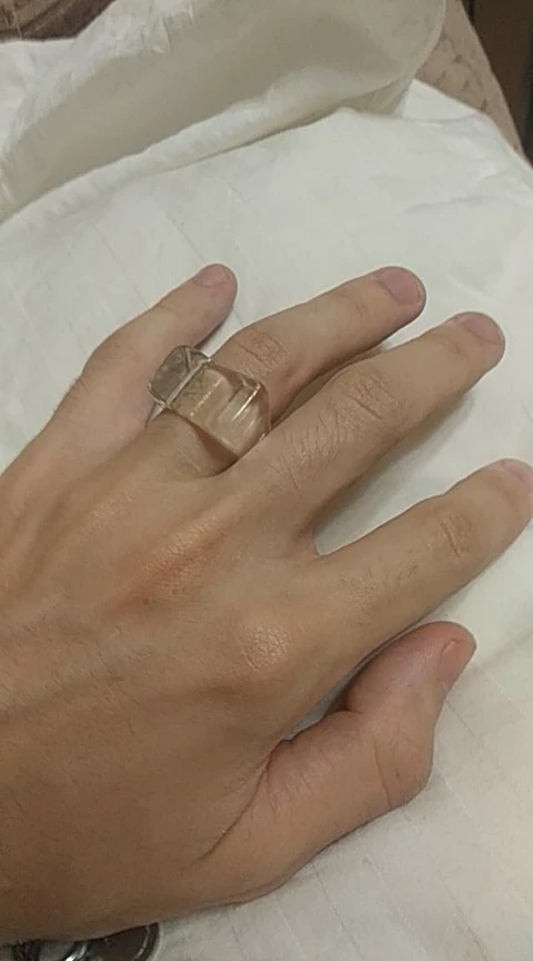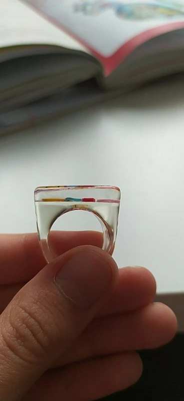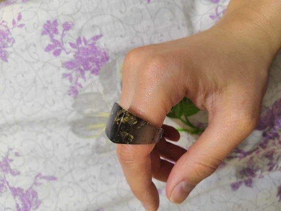 Кольцо как на картинке, на пальцах выглядит шикарно. Только один минус оно мне на маленькое на среднем, а на безымянном не особо нравится носить. А возможность выбрать побольше нету. Сделано из пластика, царапины не появились, во время носки, или их не видно.