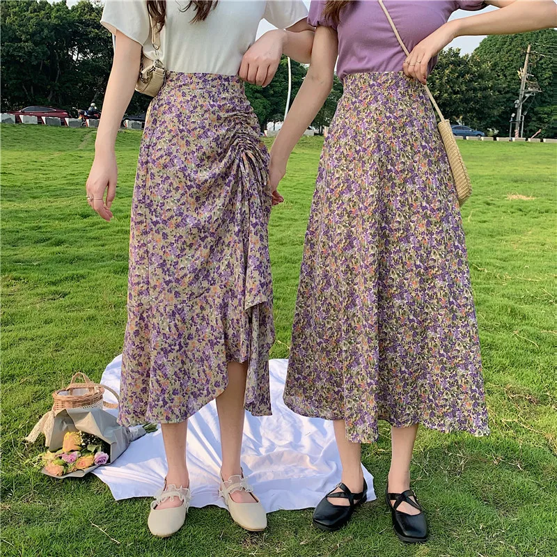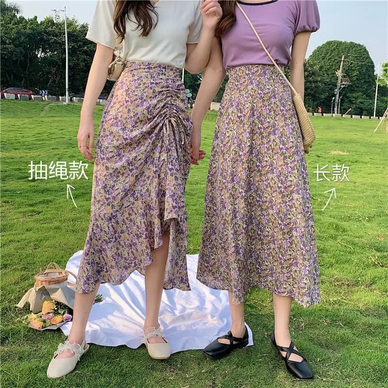 Винтажные гофрированные длинные юбки с цветочным принтом, летняя Женская Корейская юбка, уличная юбка средней длины с эластичной резинкой на талии