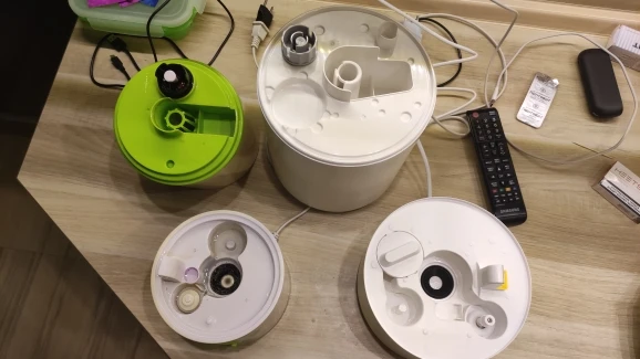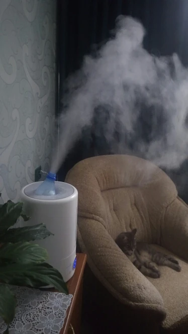 Приехал новый увлажнитель. Раза в полтора больше предыдущего на 2,5 литра (производство гараж дядюшки Ляо). Конструктив практически идентичен за исключением УФ лампы. Дирма показывает правильно температуру и влажность, старый так не мог, завис на 25 градусах и 30% влажности. Поток воздуха у нового не очень - надо побольше оборотов вентилятора или думаю снять силиконовую площадку под соплом. Так же фото на всех трёх скоростях работы. Сильно включать не выйдет иначе туман не успевает испариться и мочит все вокруг прибора. Блок питания внутри кака - свистит если прибор воткнут в розетку. В целом я доволен.