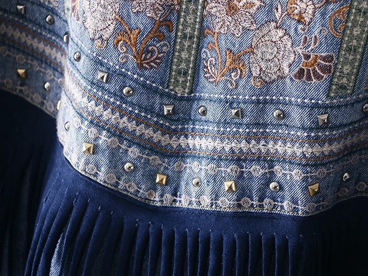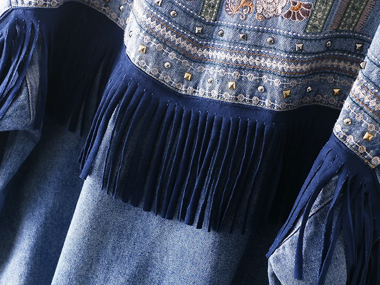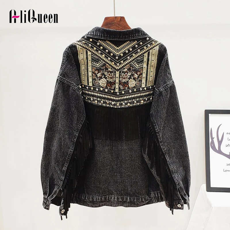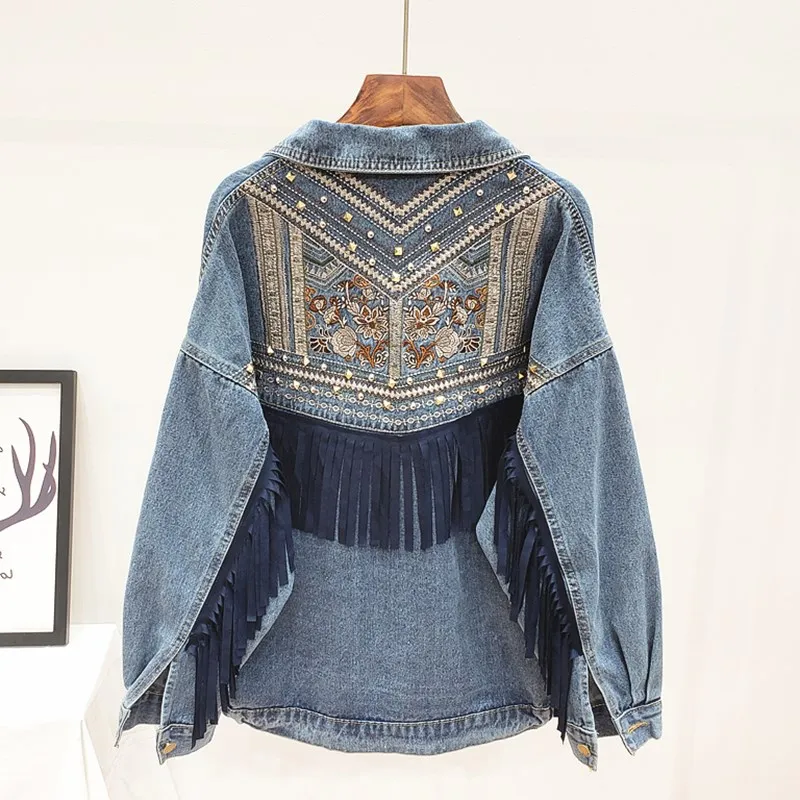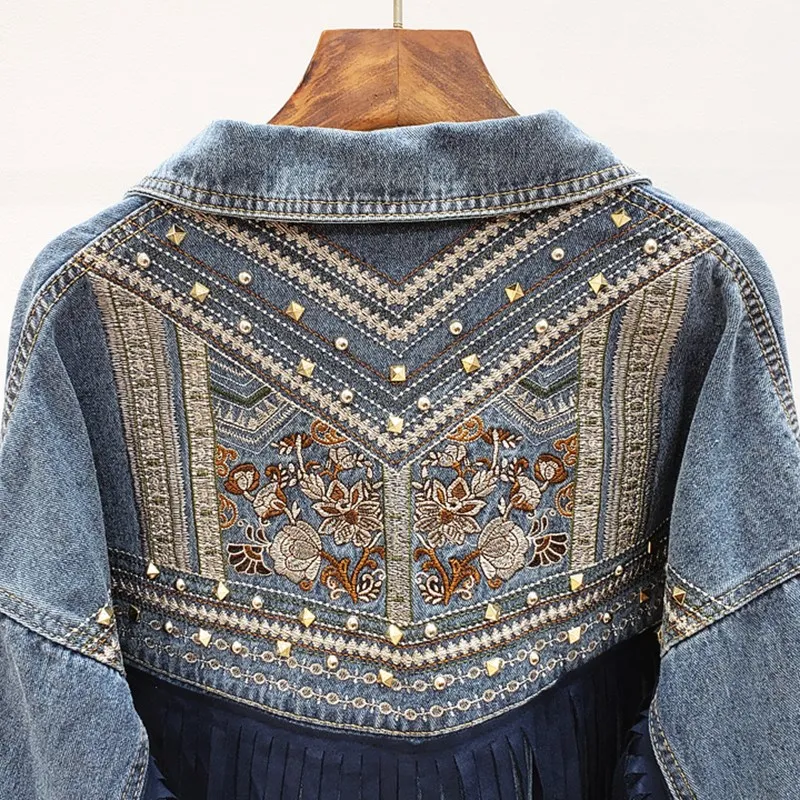 Осенняя уличная одежда, джинсовая куртка для женщин, джинсовая куртка с ручными заклепками и бахромой с вышивкой, свободные пальто, женская верхняя одежда