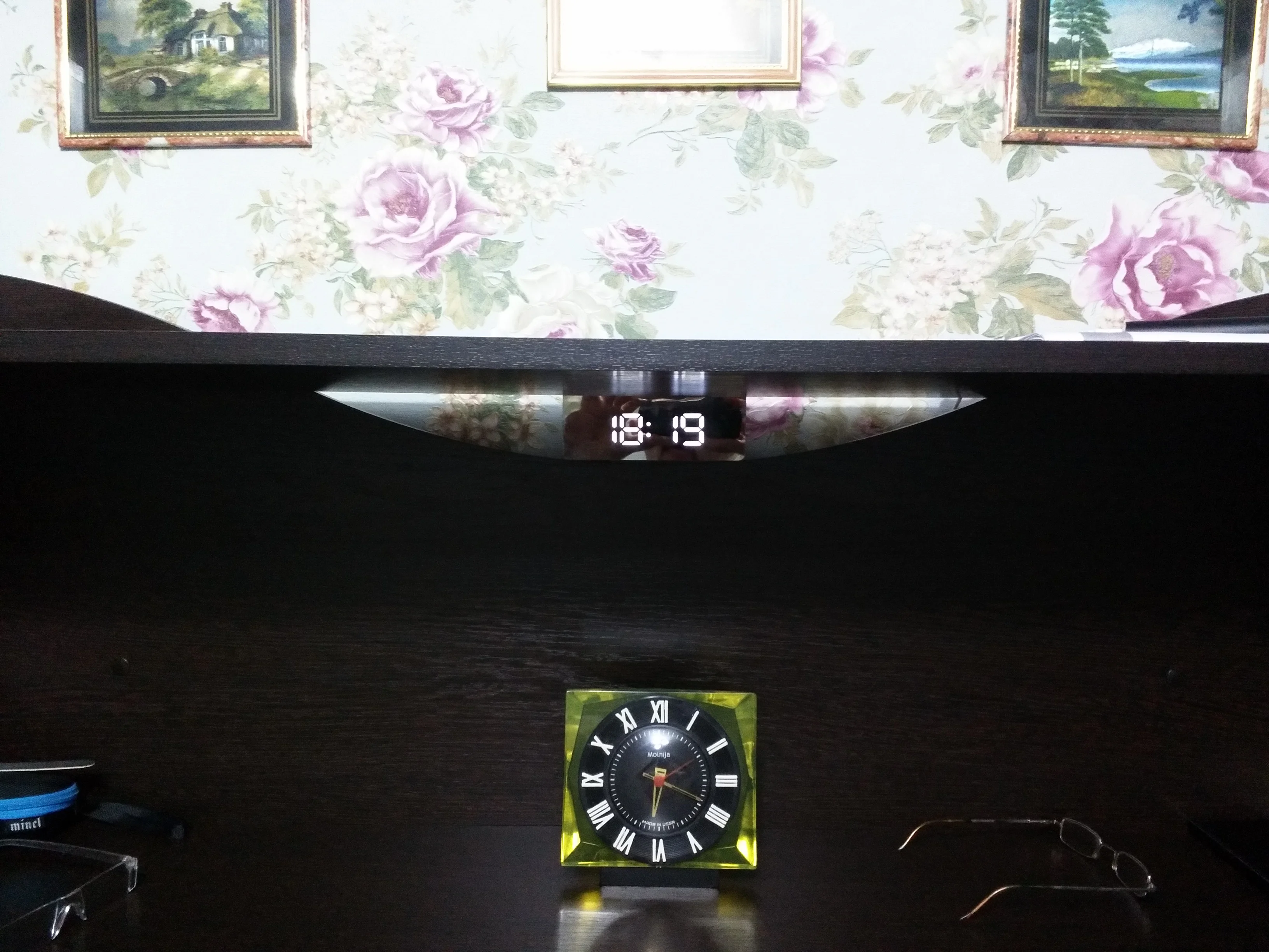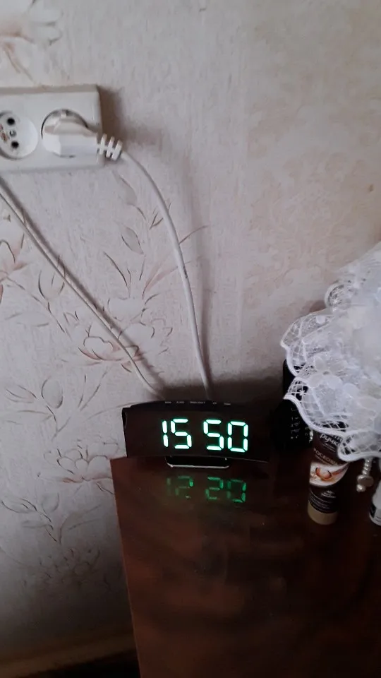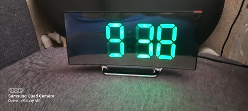 Часы хорошие. 2 режима яркости. Цифры крупные. Высота 45 мм. При работе только на батарейках уходят в экономный режим (цифр не видно).