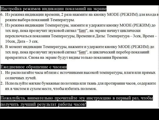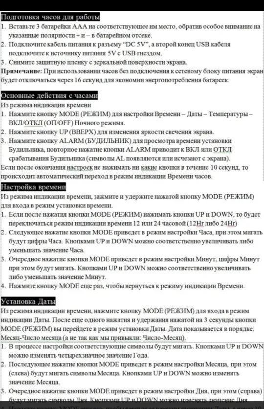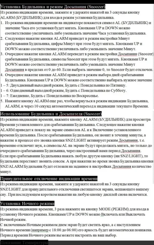 Пока, не разобралась, как настроить часы. Нет описания на русском языке. Часы понравились. Цифры крупные. Спасибо продавцу.