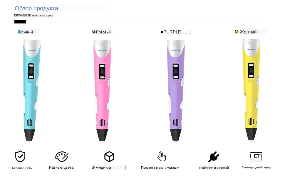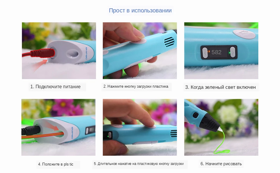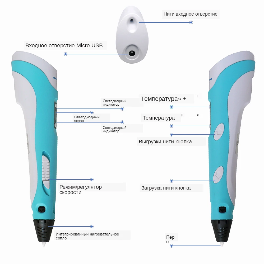 Ультра безопасно! Прошел сертификацию CE/RoSH/FCC/EN71. Регулируемая скорость печати! Включите регулировку скорости, сползая соответствующую кнопку. На каждый день, 3 цвета нитей! Набор 3d-ручек с нитью накаливания 9 метров (включает 3 цвета) В режиме реального времени отзывы! Светодиодный экран способен отображать температуру тока особенно быстро. Автоматический спящий режим! Перо автоматически переходит в спящий режим, если вы не используете его в течение 2 минут или дольше. Прост в использовании Желтый светильник показывает мощность. Нажимаемый переключатель накаливания. Красный светильник для режима нагрева, когда красный светильник поворачивается к синему, показать Предварительный нагрев закончен.