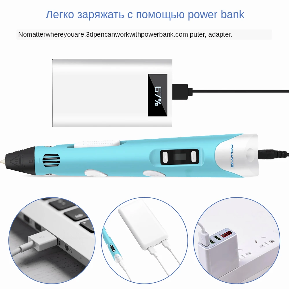 Удобно заряжает с помощью usb-кабеля (в комплекте). 3d-ручка для рисования может питаться от внешнего аккумулятора, компьютера или адаптера, легко брать в любом месте.