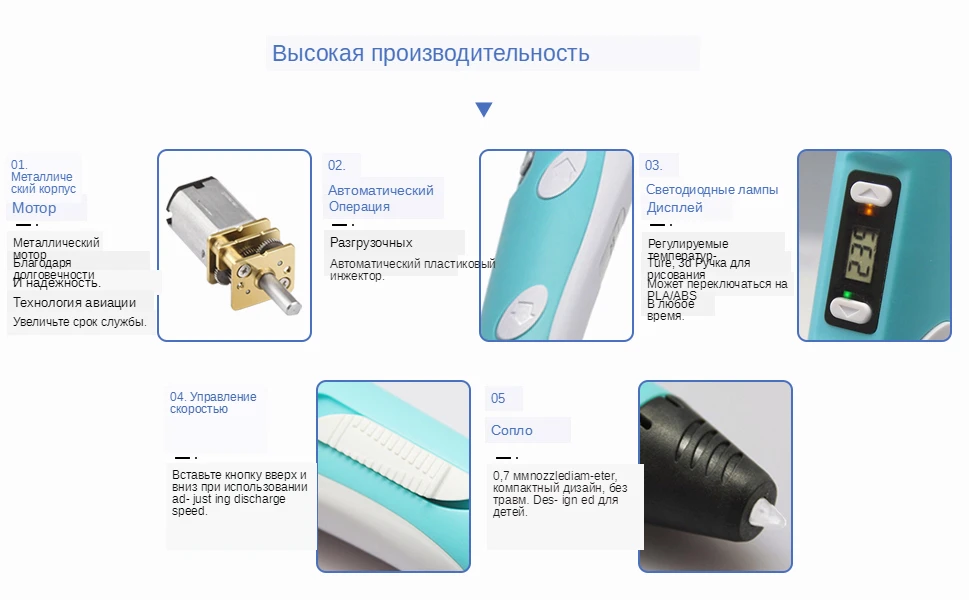 3d-ручка изготовлена из высококачественного материала. Эта ручка для 3d-печати встроена в прочный и надежный металлический мотор для обеспечения длительного использования. Эргономичный дизайн ручки 3d-ручки идеально ложится в руку. Поможет вам уменьшить усталость в течение длительного времени работы.