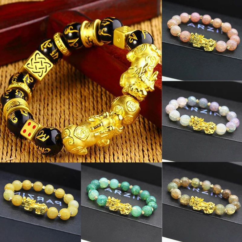 Позолоченный Браслет PIXIU Wealth Feng Shui для женщин и мужчин с разноцветными бусинами, роскошные ювелирные изделия, подарочные Браслеты Lucky Brave