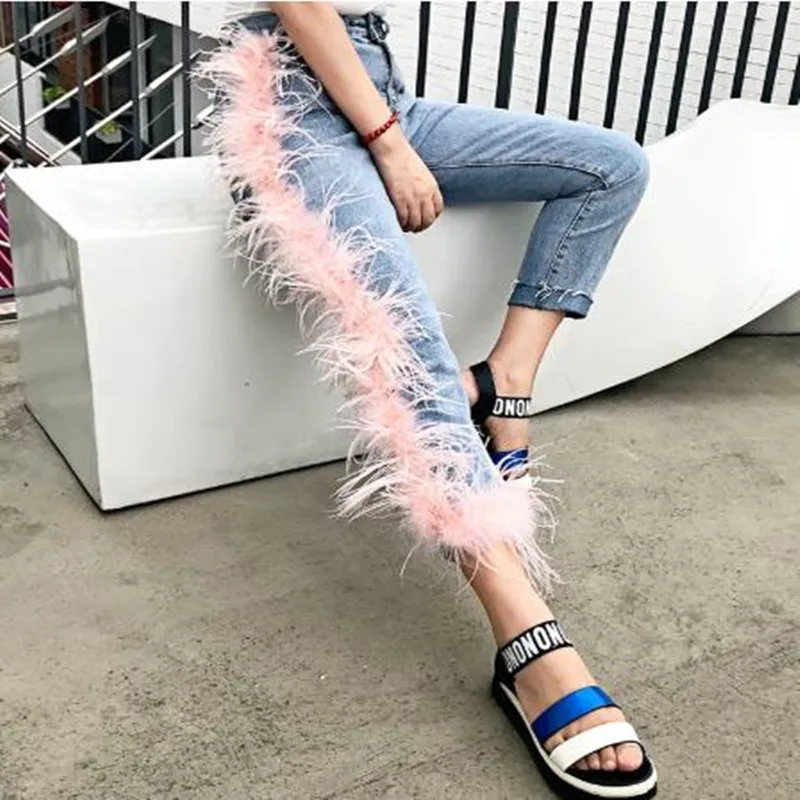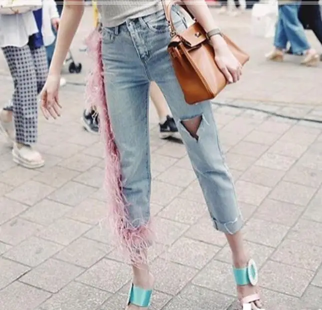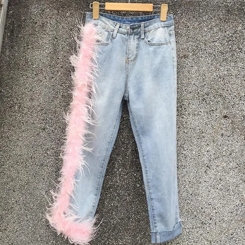 Новые женские джинсы с высокой талией и кисточками, женские брюки, джинсы с розовыми перьями