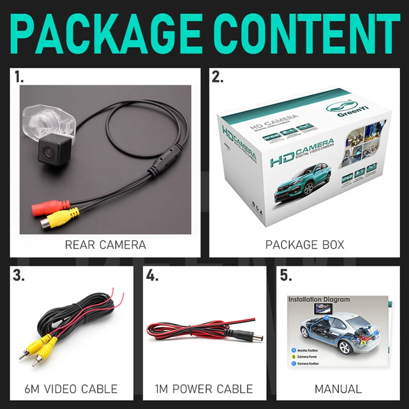 1. Камера траектории заднего вида2. Саморезы и коробка3. Видео кабель 6 м4. Кабель питания5. Руководство пользователя