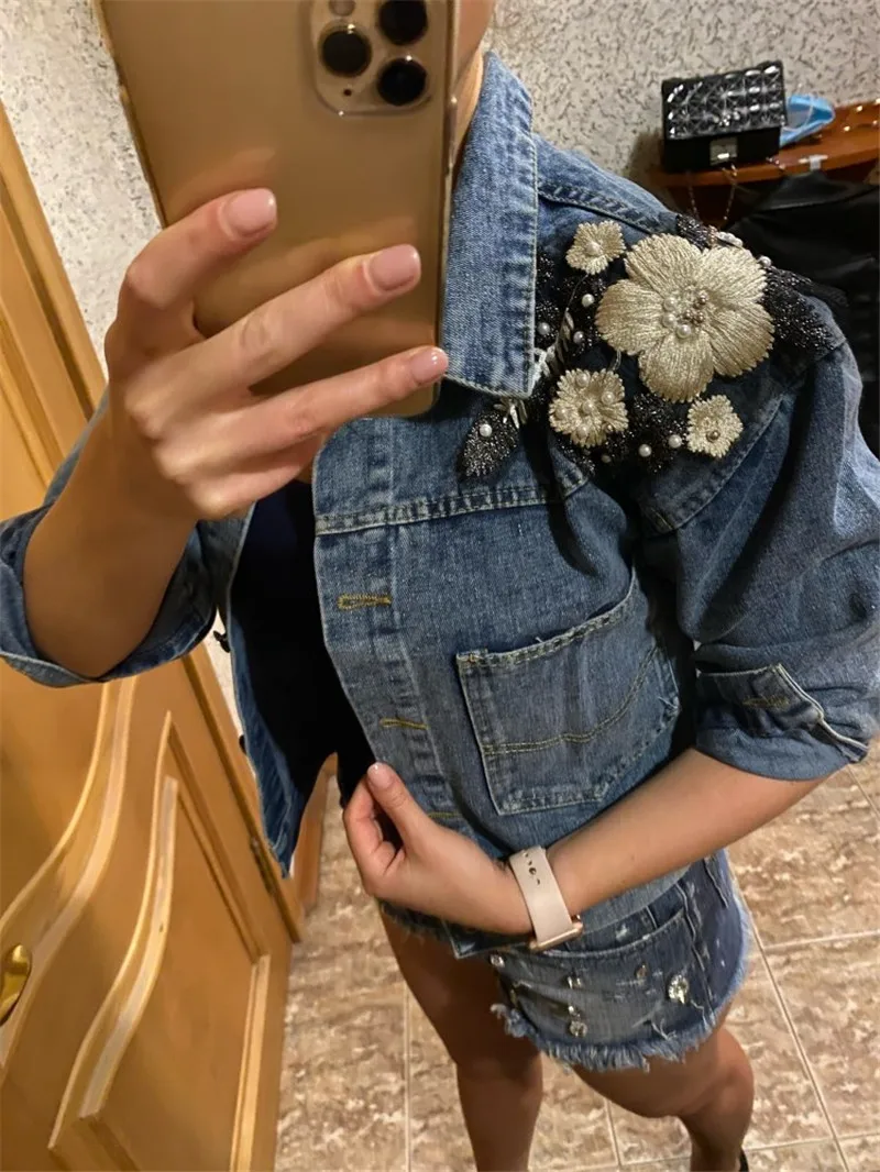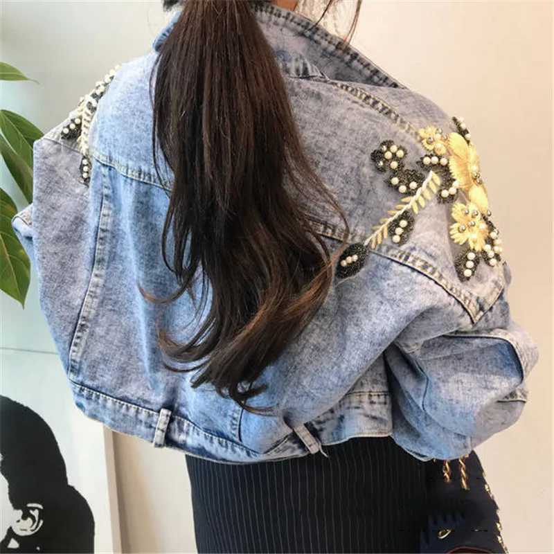 Куртка джинсовая женская короткая, с вышивкой жемчугом и бисером, с длинным рукавом, 2020