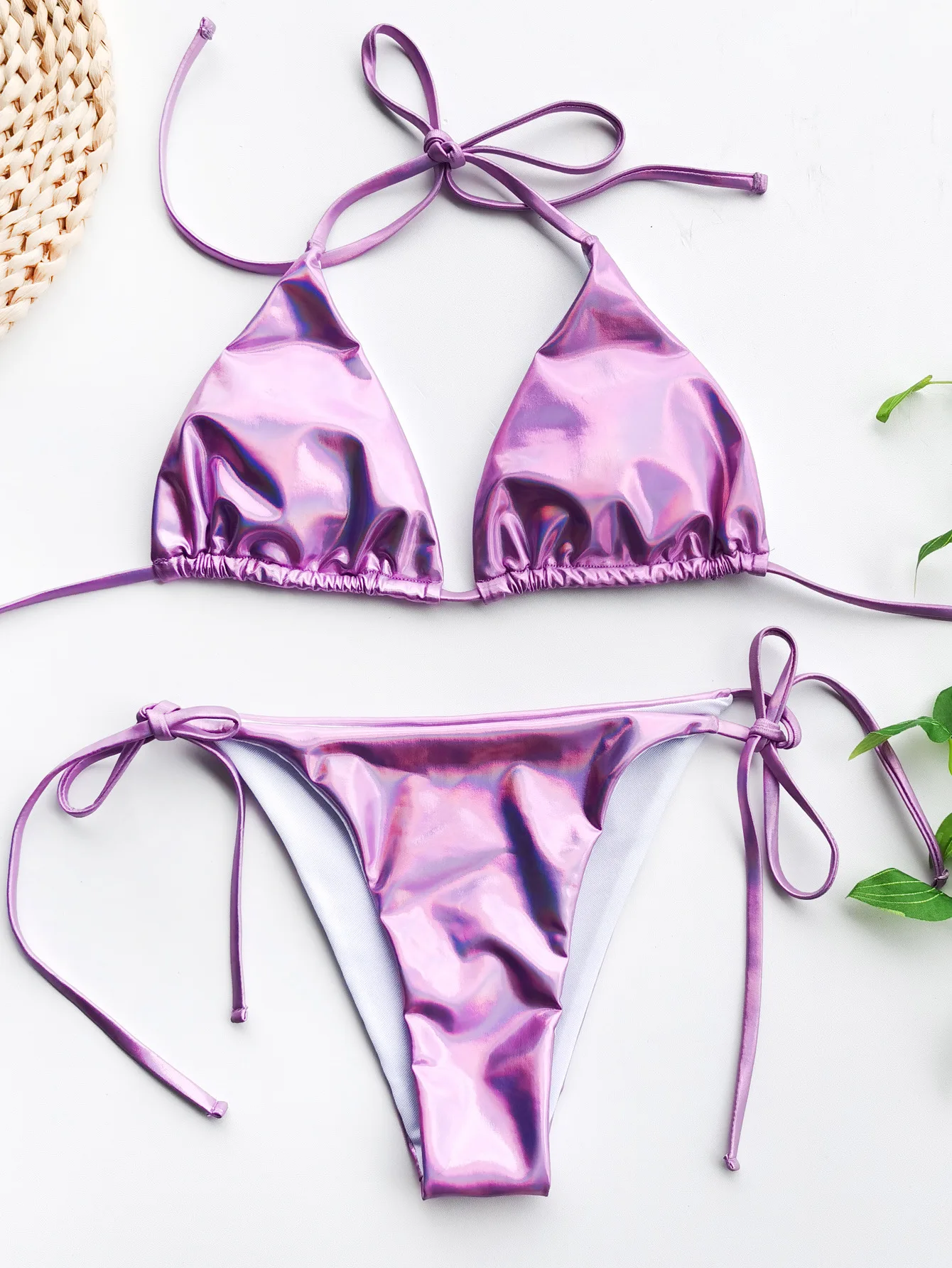 Melphieer золотые блестящие кожаные бикини с лямкой на шее 2020 комплект бикини женский купальник женский купальный костюм оптом пляжная одежда