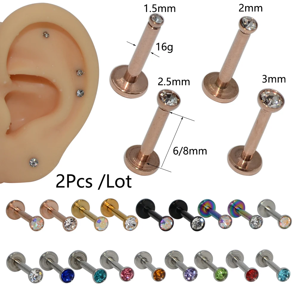 Серьга-гвоздик из нержавеющей стали для пирсинга губ, 2 шт., 16 г, 1,5-3 мм, с цирконием ААА, для установки на хрящевую Ткань ушной раковины, козелка ушной раковины