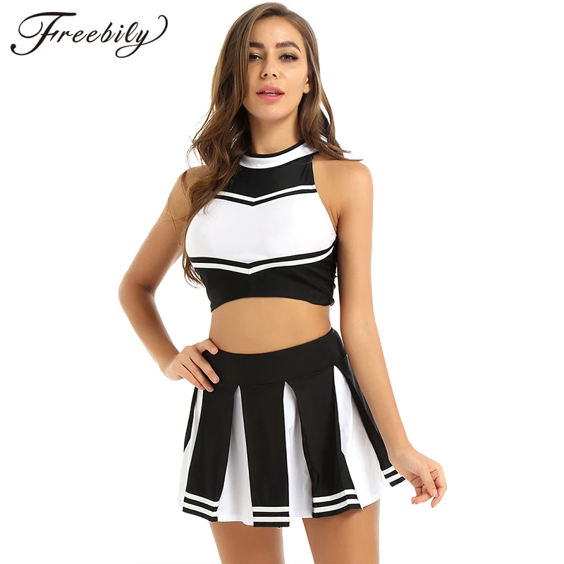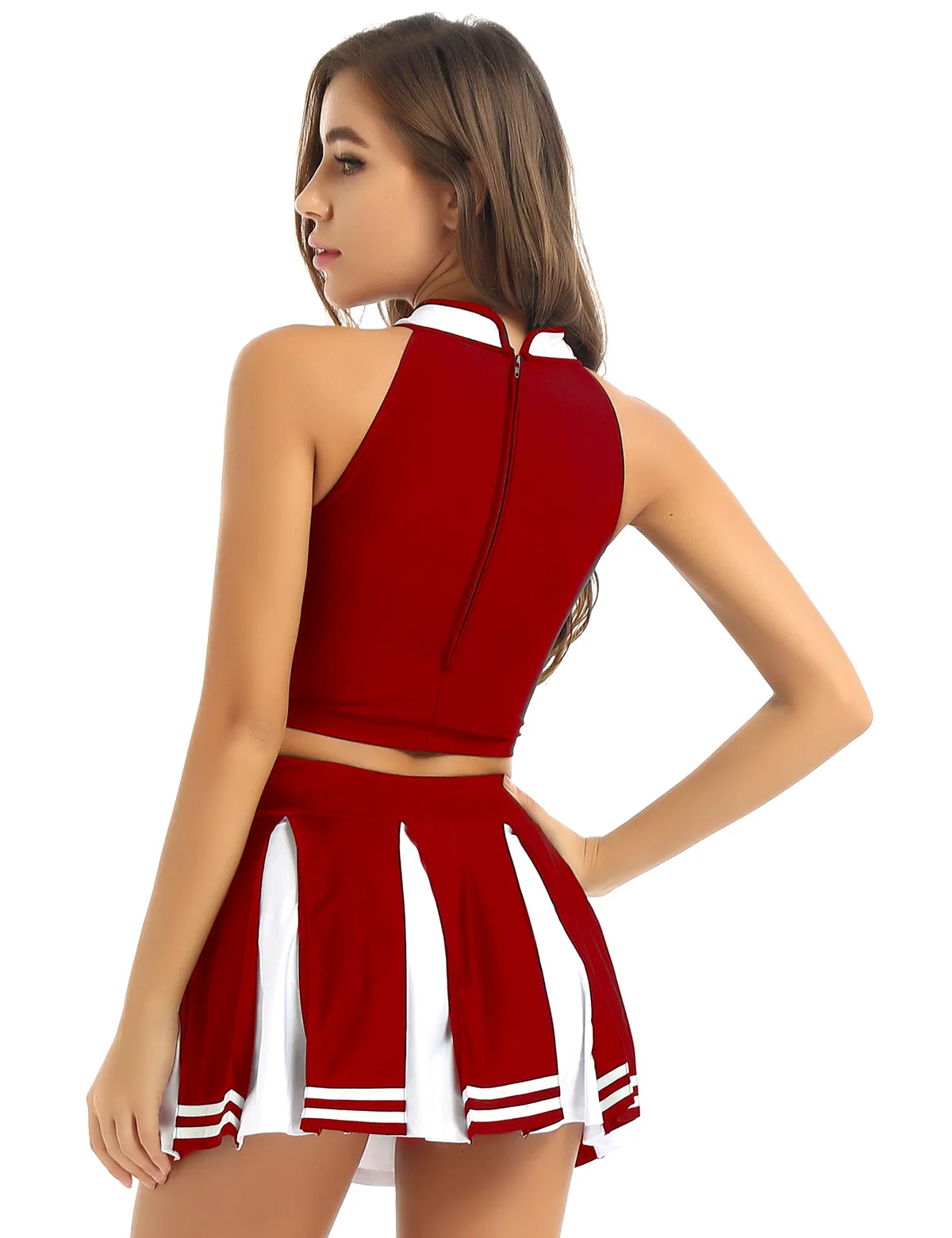 S-XL, комплект из 2 предметов для женщин и взрослых, костюм черлидера, Униформа, наряд с воротником-стойкой, укороченный топ без рукавов с мини-плиссированной юбкой