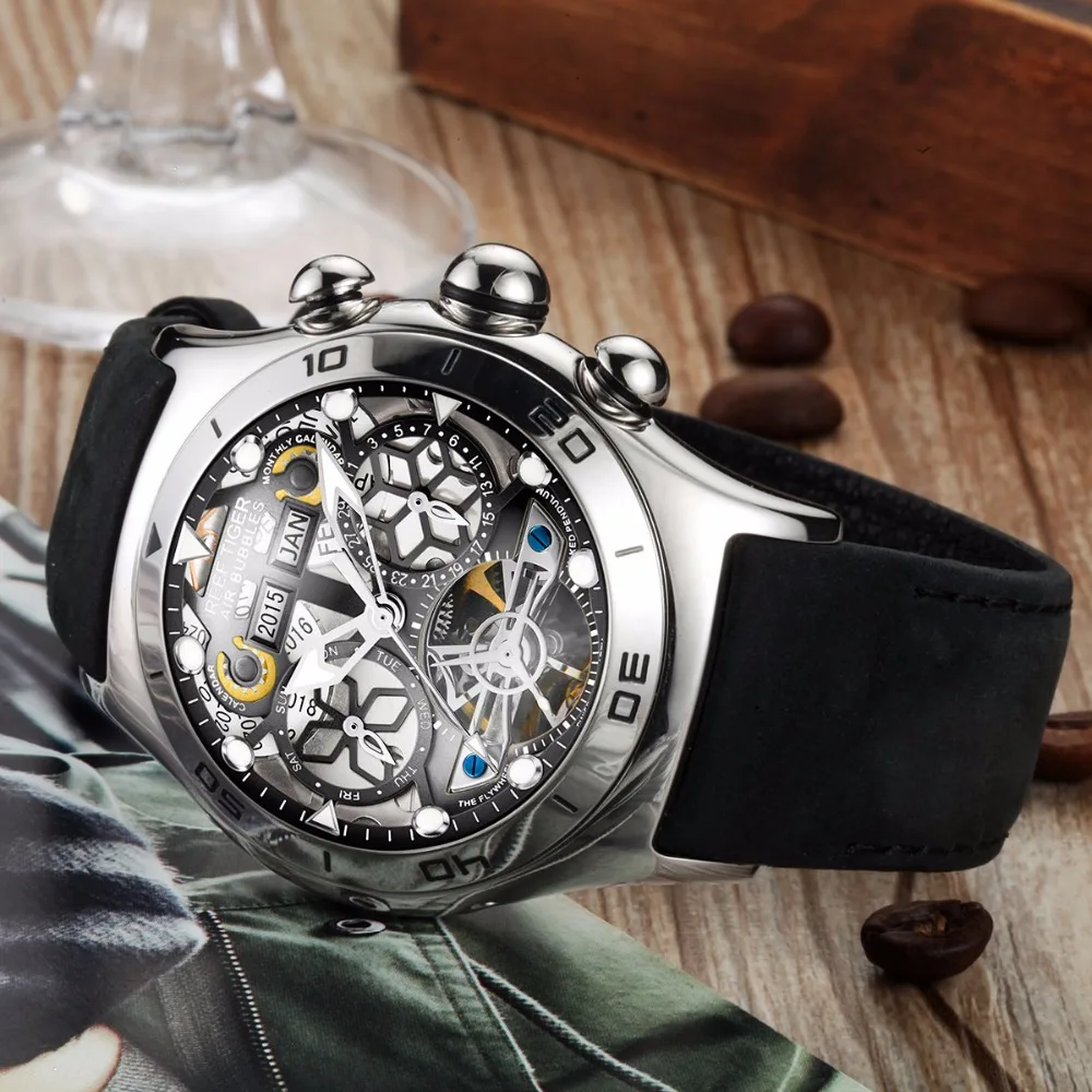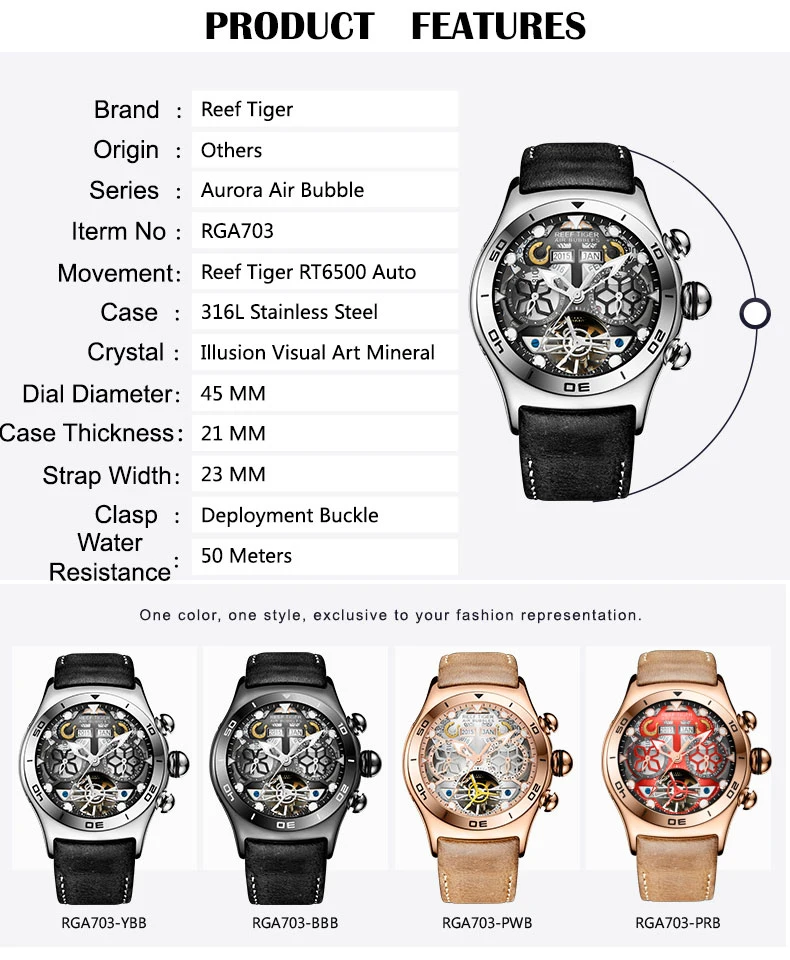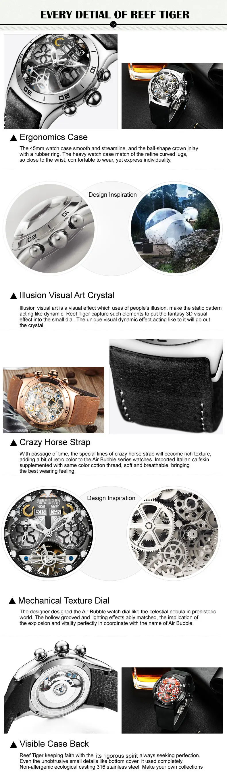 Мужские спортивные механические часы Reef TigerRT, водонепроницаемые часы с автоматической датой, 2021 м, роскошные часы с турбийоном, 100