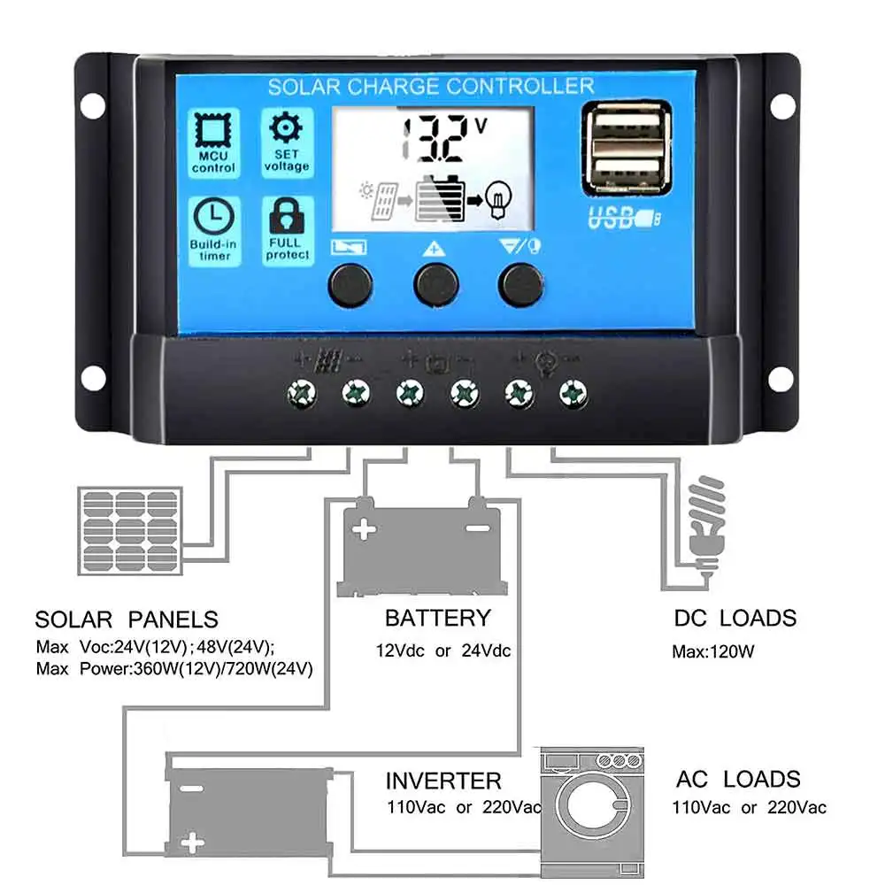 1. Подключите аккумулятор к зарядному регулятору-плюс и минус. Он покажет 1, если он обнаруживает аккумулятор 12 В, 2, если он обнаруживает батарею 24 В.2. Подключите фотоэлектрический модуль к регулятору-плюс и минус.3. Подключите потребителя к регулятору заряда-плюс и минус.