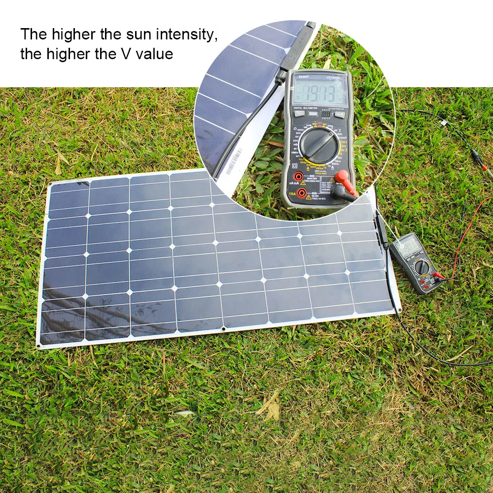 Изготовлено из монокристаллической солнечной батареи, Гибкая солнечная панель 16V100W весит светильник, всего 2 кг, сгибается до 30 градусов для изогнутой поверхности, с водонепроницаемым разъемом, просто подключи и работай. Гибкая солнечная панель также может использоваться для различных применений, включая питание на лодке, фургоне, гольф-машине, трицикл, крышу палатки, даже если вы повесили на окно, чтобы включить свет и другие приложения постоянного тока. 100 Вт солнечные панели можно заряжать портативным зарядным устройством на 12V и 24V гелевый Аккумулятор, свинцово-кислотных аккумуляторных батарей, потоп, батареи или зарядного устройства 3,7 V, 6V, 9V литиевая батарея и других устройств постоянного тока с регулятором.