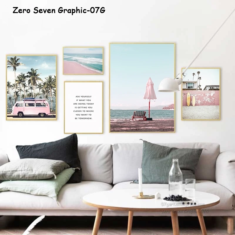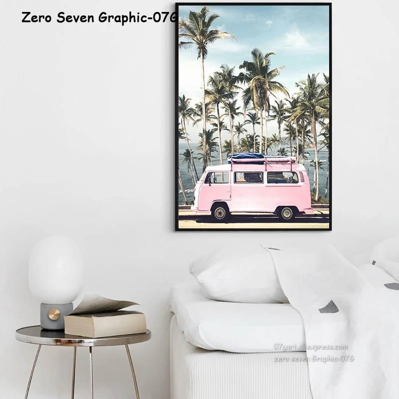 Холщовые плакаты с принтом, летняя пляжная розовая палатка для серфинга, автомобиля, пальмовые деревья, праздничная поездка, расслабляющая картина, настенное художественное украшение для гостиной