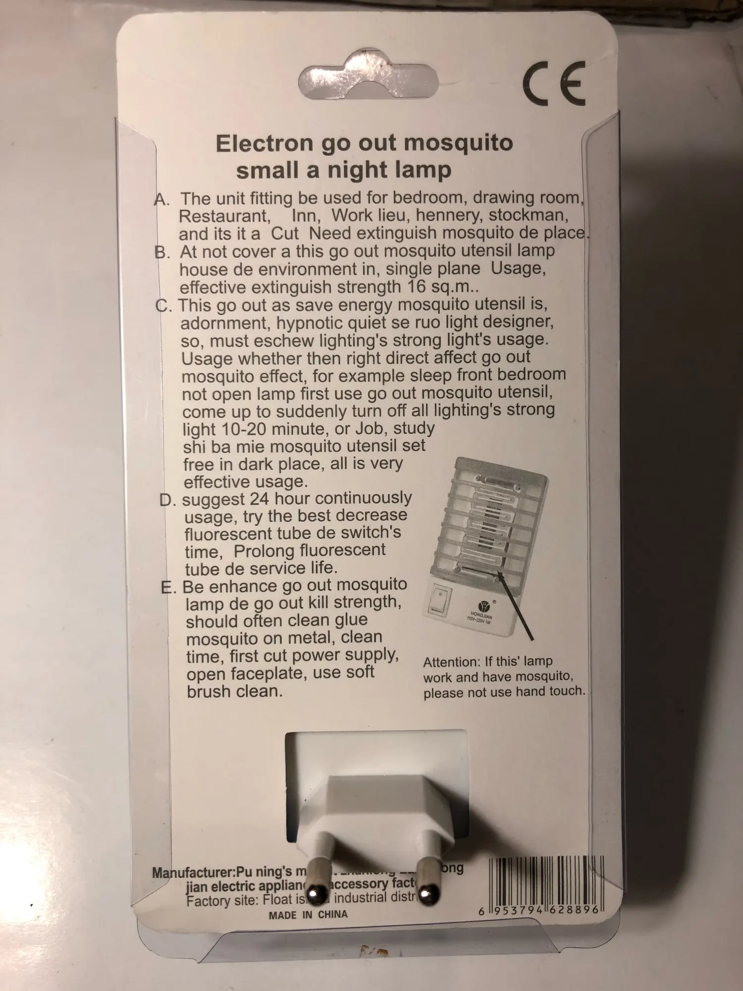 Заказал Лампу-ловушка для комаров и мух! Заказ был сделан за монеты Алиэкспрес. Продавец ловушку отправил по истечению трех дней! В дороге посылка отлеживалась, была платная доставка! В центральную Украину доехало за 21 день! Пришло уведомление с Новой Почты, одна сборная большая посылка от других отправителей ( удобно)! Качество среднее, при включении горят привлекательные диоды для насекомых там же две сетчатые пластины( даже после отключения с розетки был снят защитный пластик, прикоснувшись к пластине ощутил накопленный заряд, повторно дотронулся заряд оставался (насекомые оценят (сарказм)) Полные испытания по весне) Товар соответствует описанию (ночью работать будет, как по мне Точно! Всем Успехов! Мир Вам!