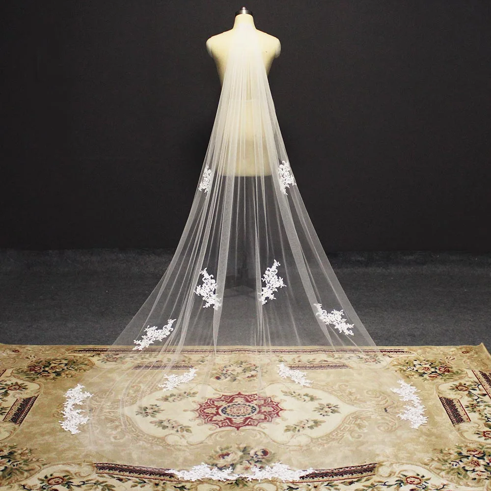 Элегантная Длинная свадебная вуаль с кружевной аппликацией белого цвета и цвета слоновой кости из Мягкого Тюля, 3 метра, свадебная вуаль с расческой, свадебные аксессуары