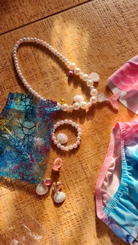 Моей дочери нравится смотреть мультфильмы русалки и часто фантазировать о том, что она Русалочка, поэтому я купил этот костюм в качестве сюрприза для нее. После получения товара, моей дочери и мне он очень понравился. Упаковка не повреждена, ожерелье очень красивое. Она рада, что в этом она выглядит как русалка. Это здорово. Моя дочь не хочет снимать его сейчас. Я отправлю ее на пляж. Я рекомендую этот магазин и продавца.