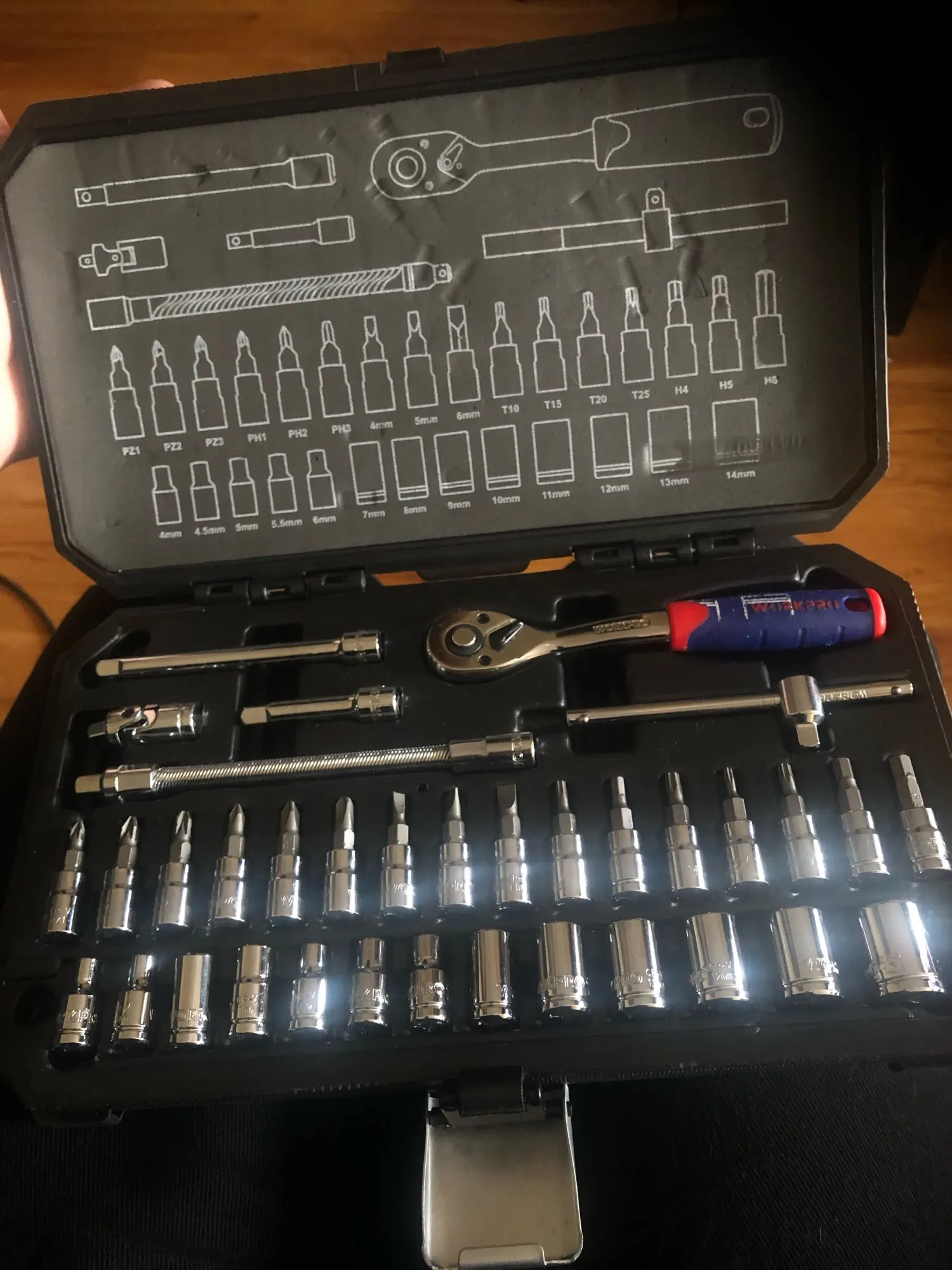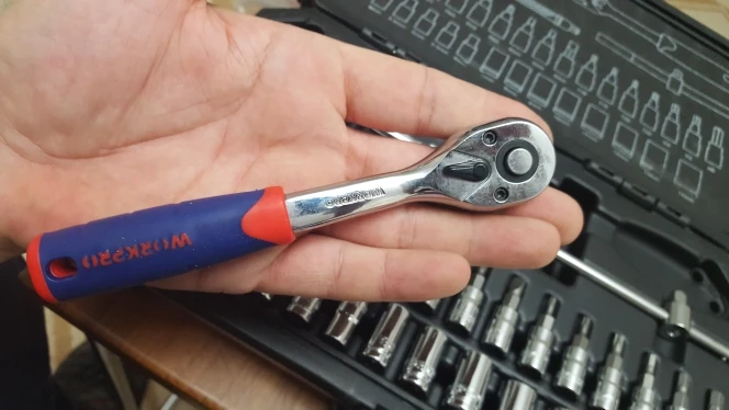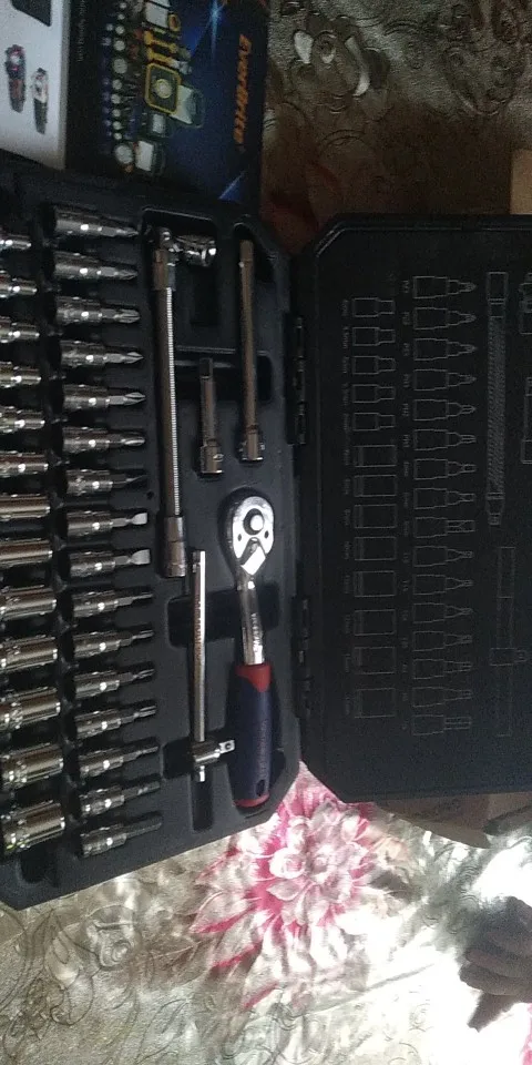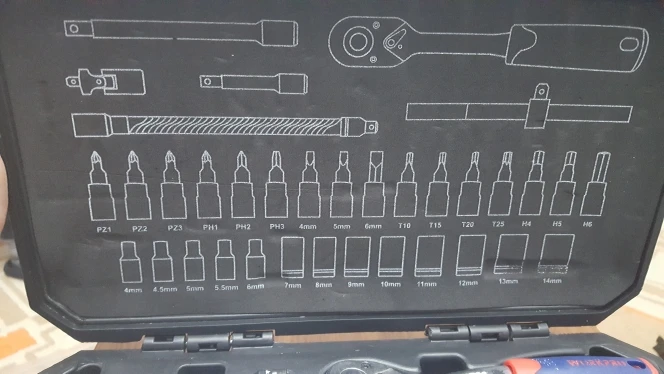 Качество футляра не на высоте: кривой пластик, нет фиксаторов, т.е. все элементы набора просто лежат каждый в своём углублении. Элементы набора сами по себе выглядят хорошо, механизм фиксации в трещётке надёжный.