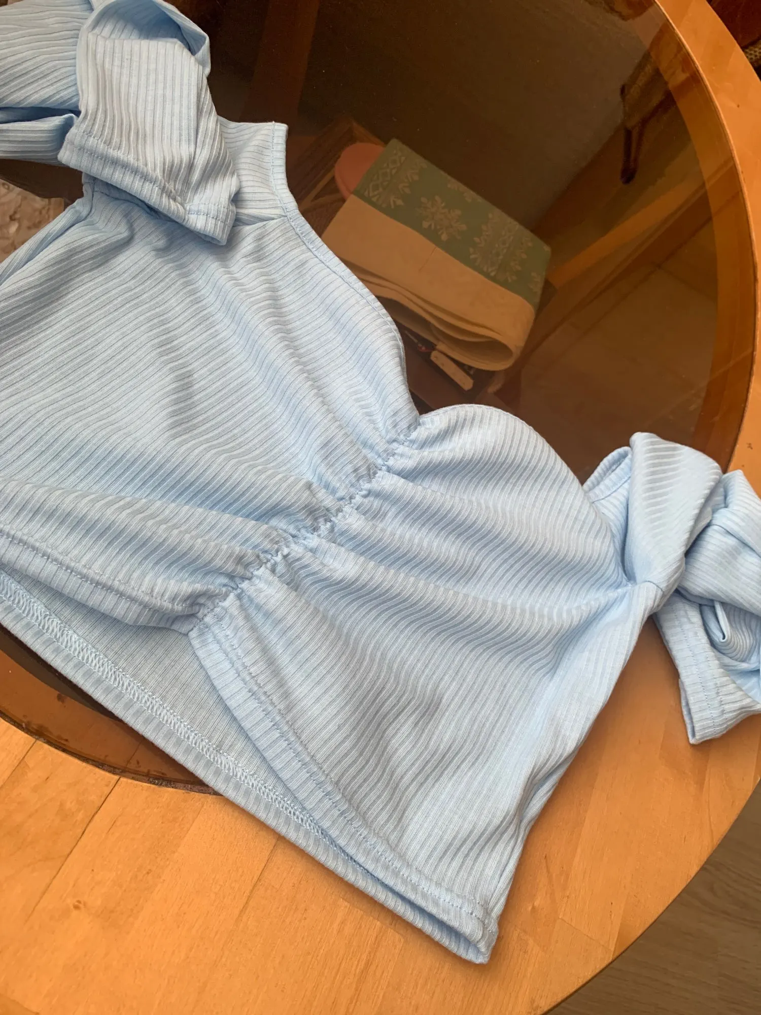 Очень красивая голубая кофточка. В рукавах свободно, тоненькая совсем, на лето.