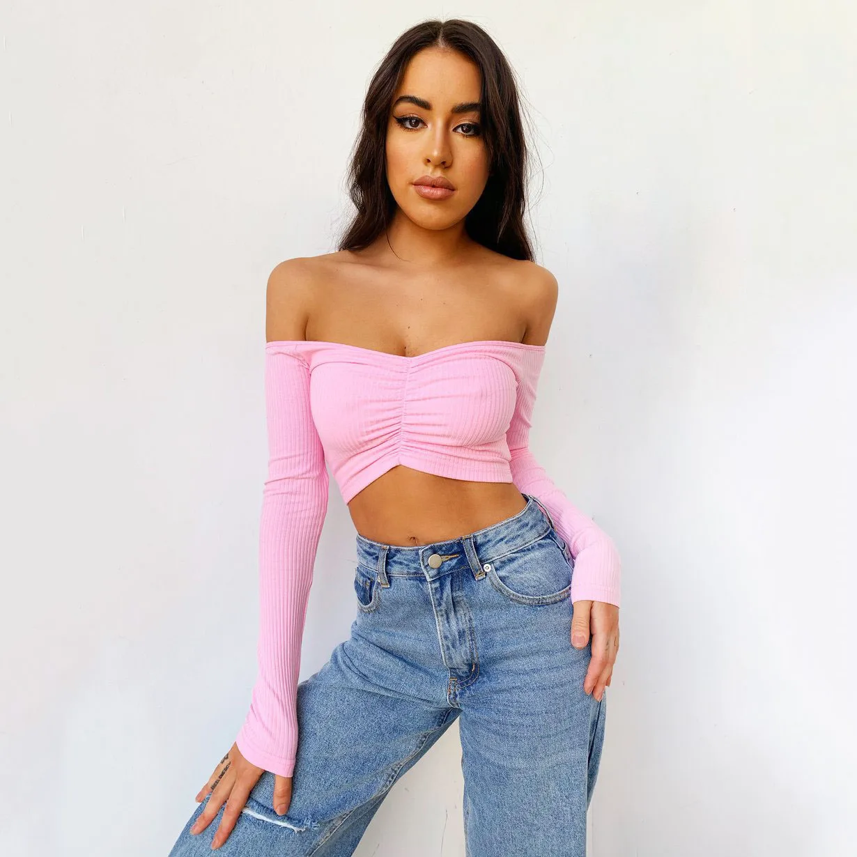 Укороченный топ с открытыми плечами, женская летняя футболка с V-образным вырезом, элегантная Праздничная Клубная футболка, женская уличная одежда, футболка с длинным рукавом
