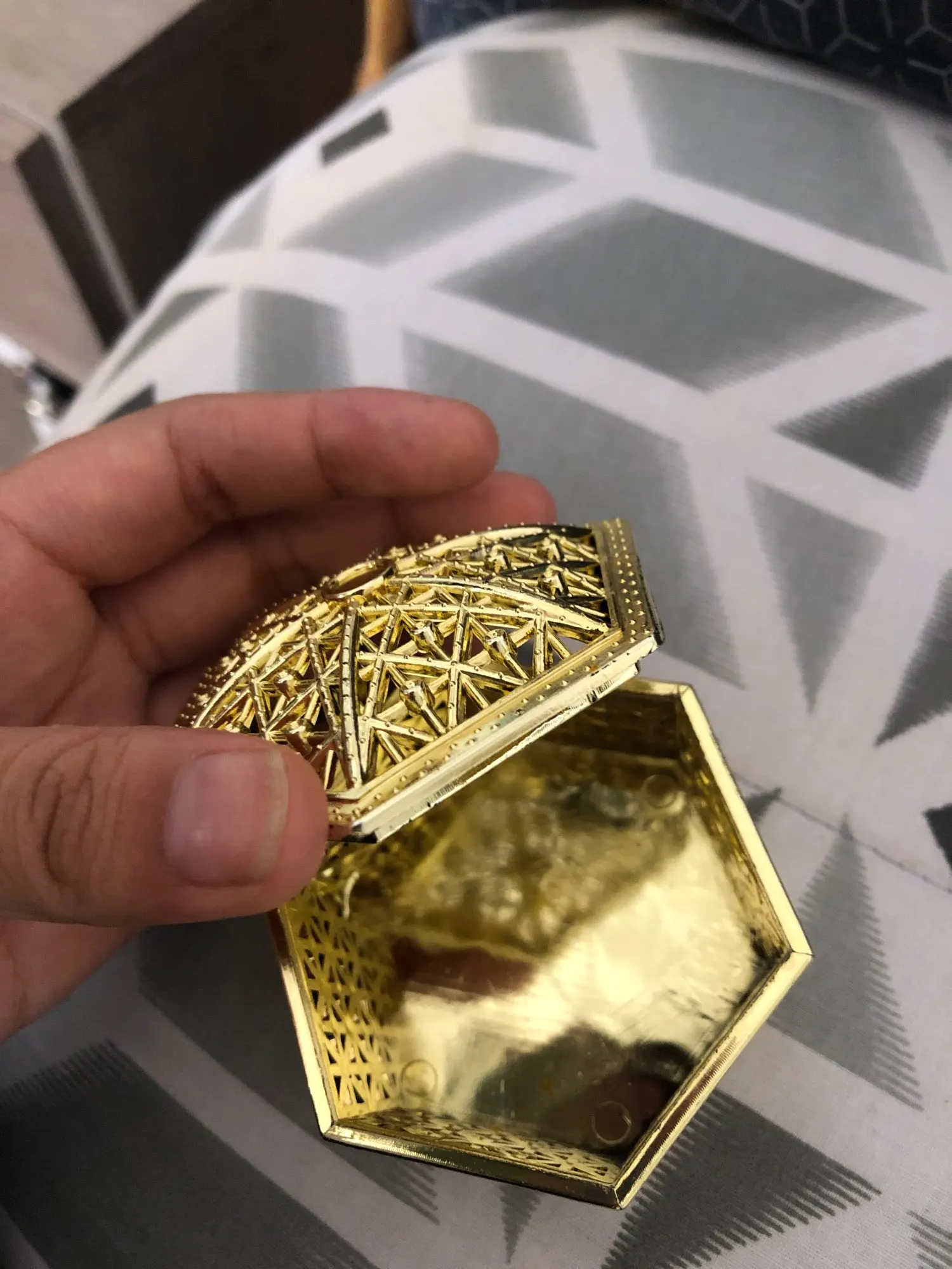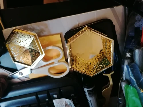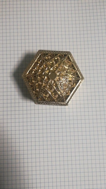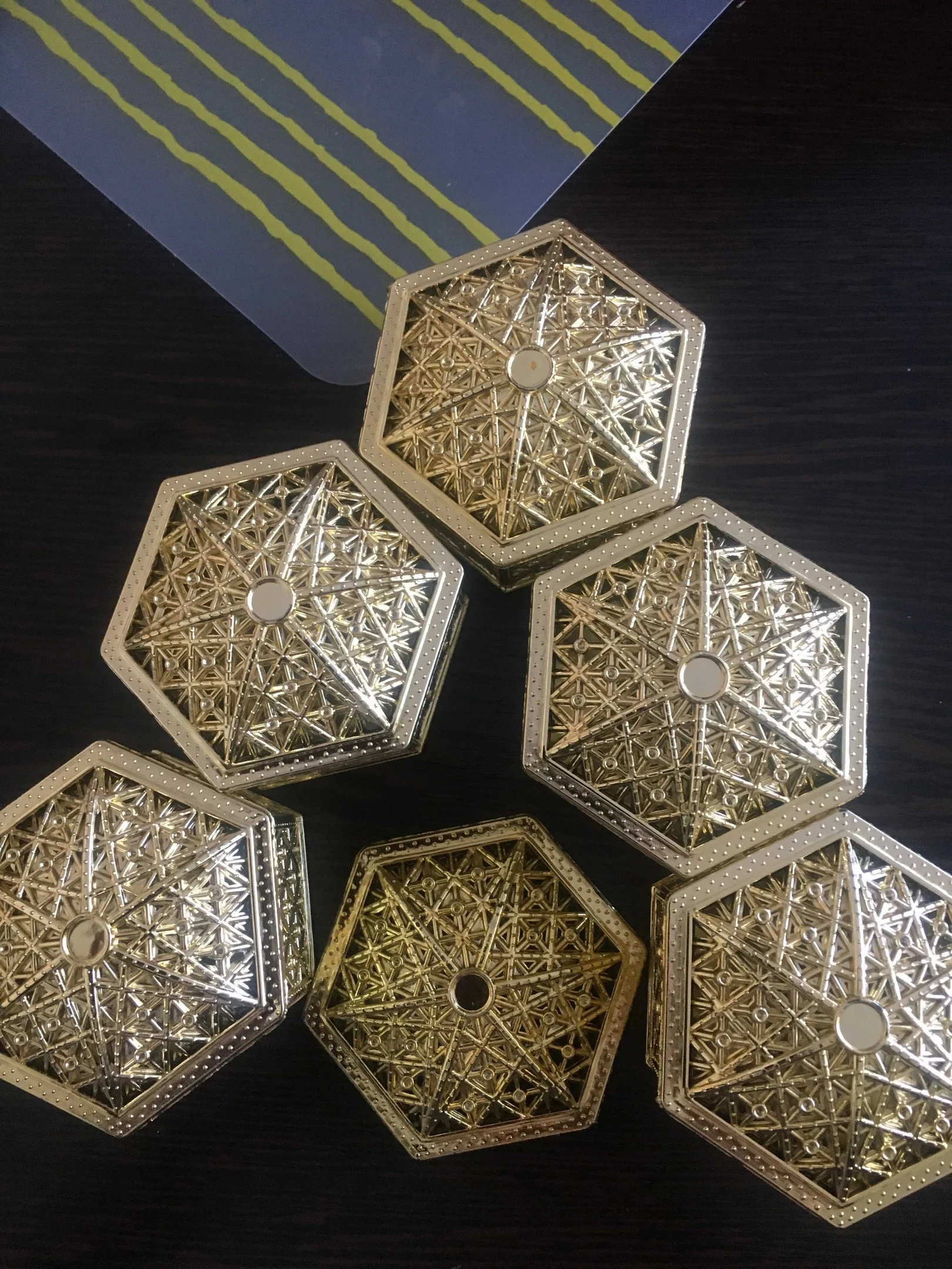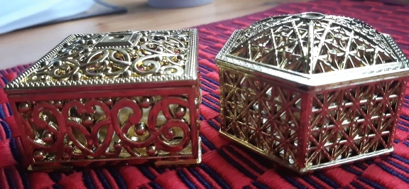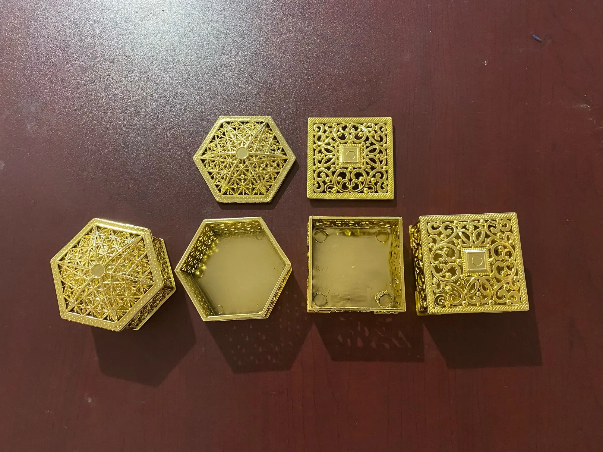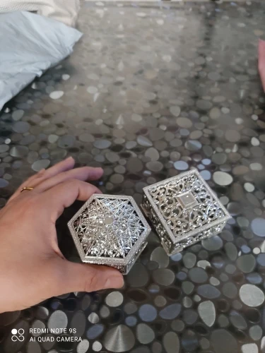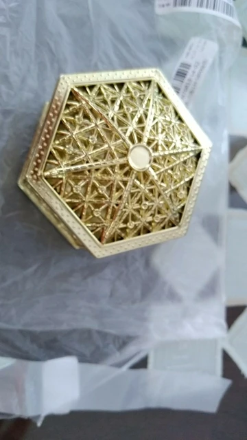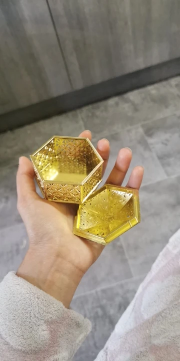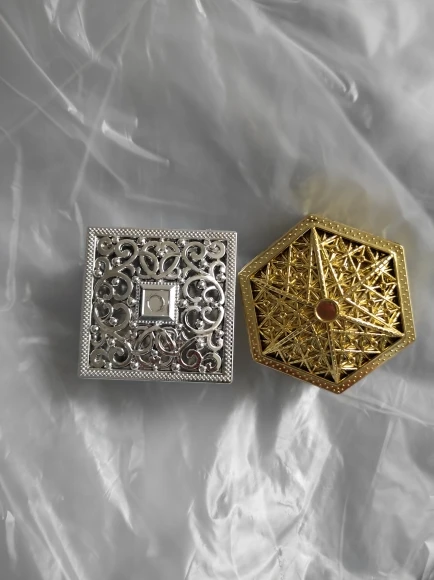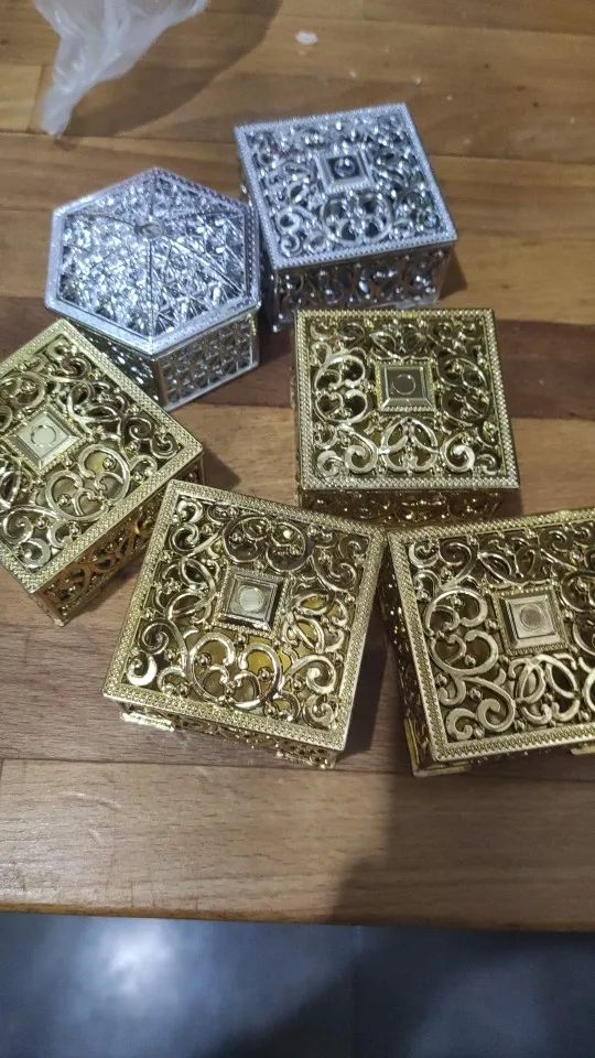 Очень маленькие коробочка. Красивая, качество хорошее, но оказались очень маленькие. Квадратные оказались красивее и золотые и серебрянные, а шестиугольные немного грубее крышечка