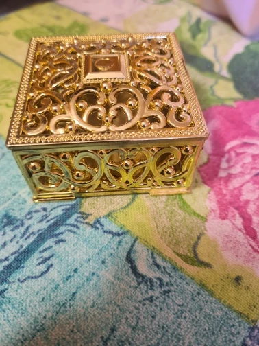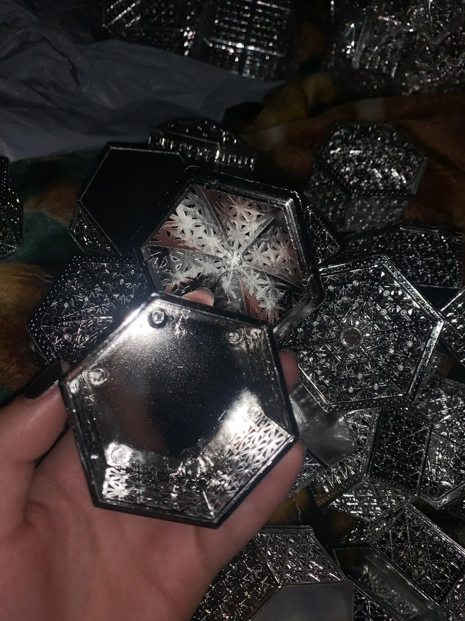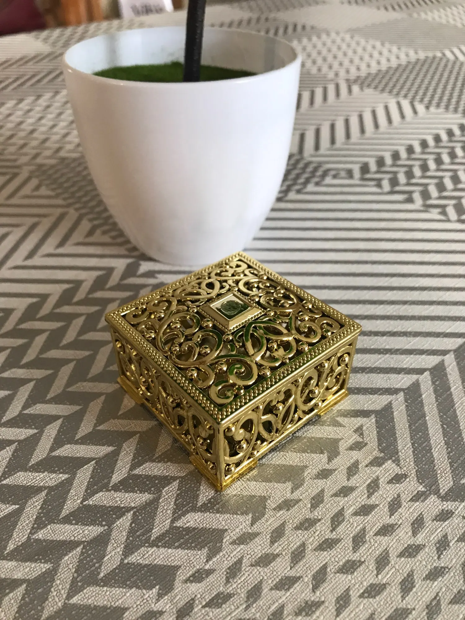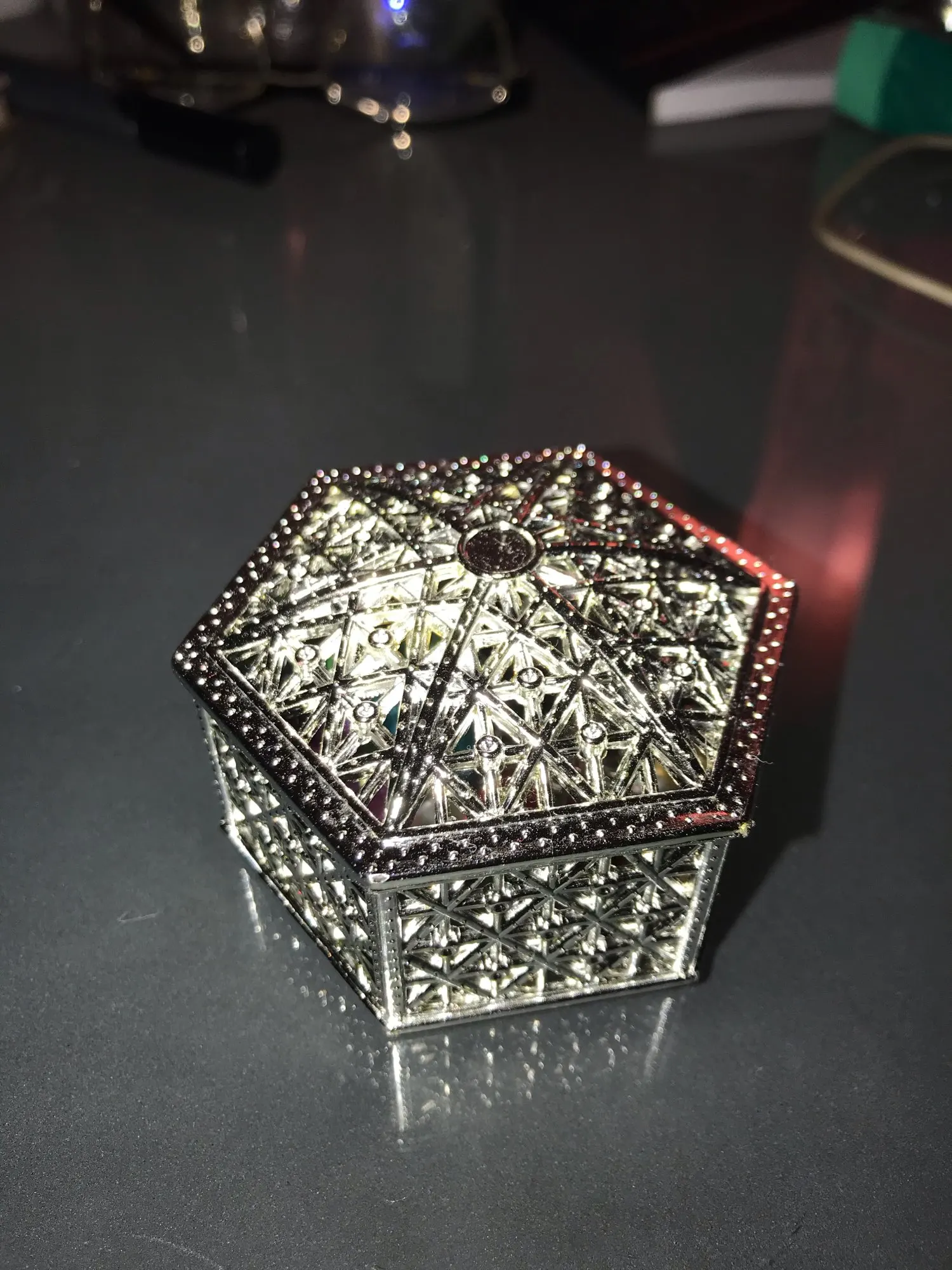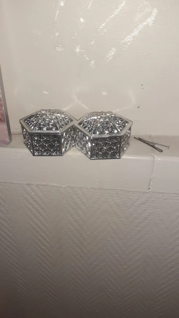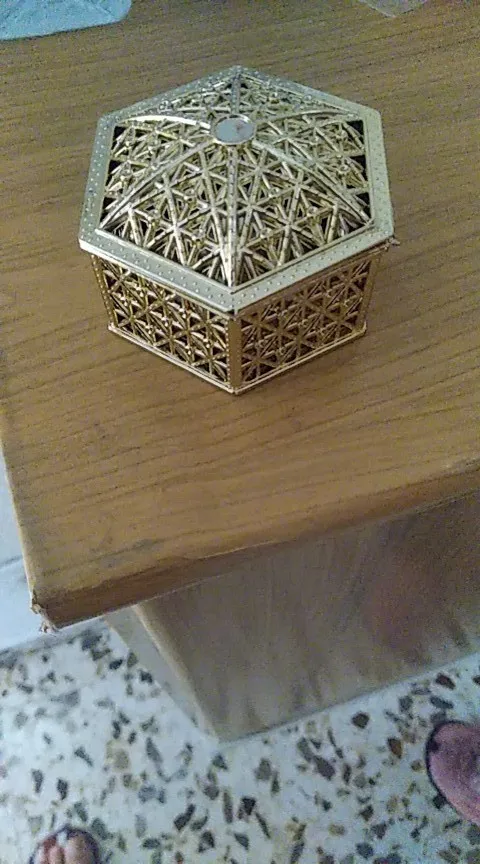 Очень маленькие коробочка. Красивая, качество хорошее, но оказались очень маленькие. Квадратные оказались красивее и золотые и серебрянные, а шестиугольные немного грубее крышечка