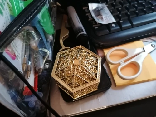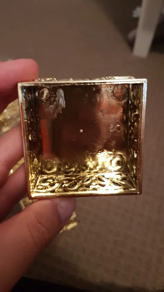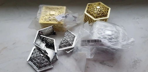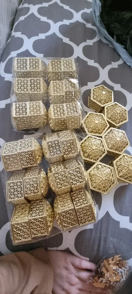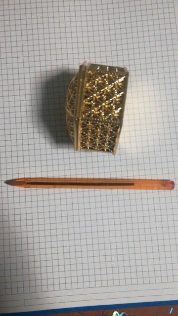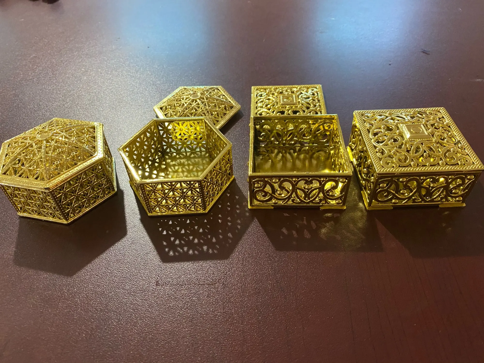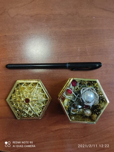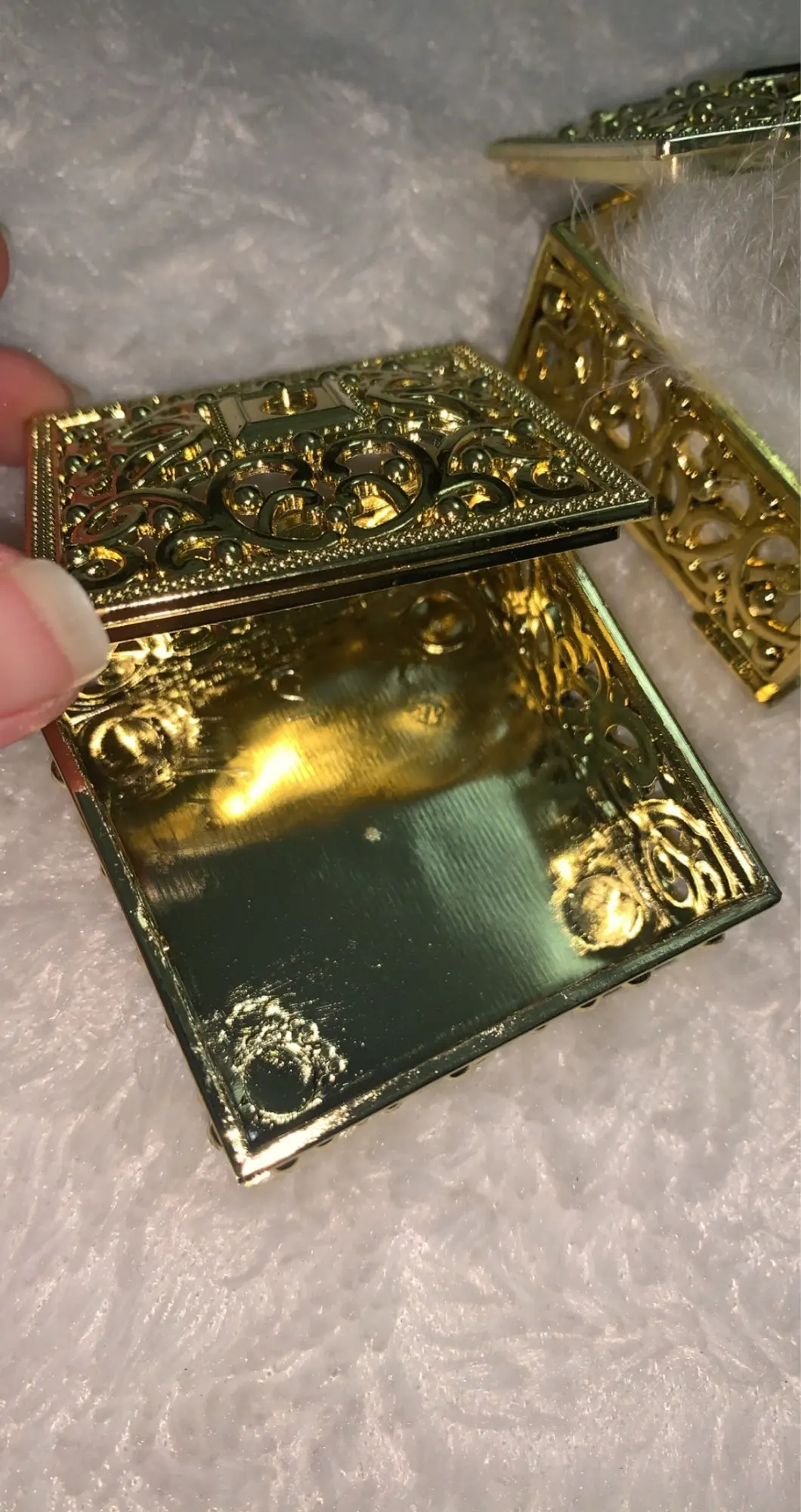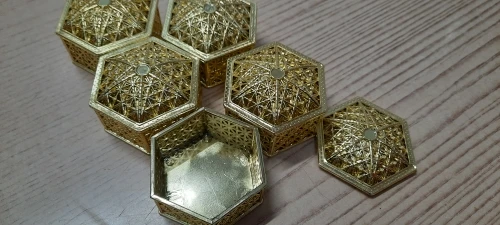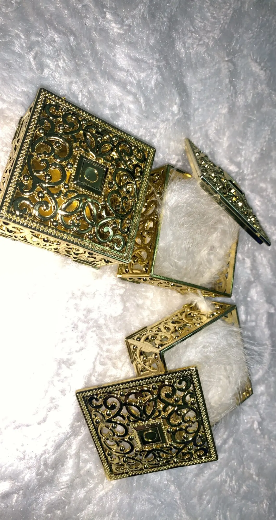 Очень маленькие коробочка. Красивая, качество хорошее, но оказались очень маленькие. Квадратные оказались красивее и золотые и серебрянные, а шестиугольные немного грубее крышечка