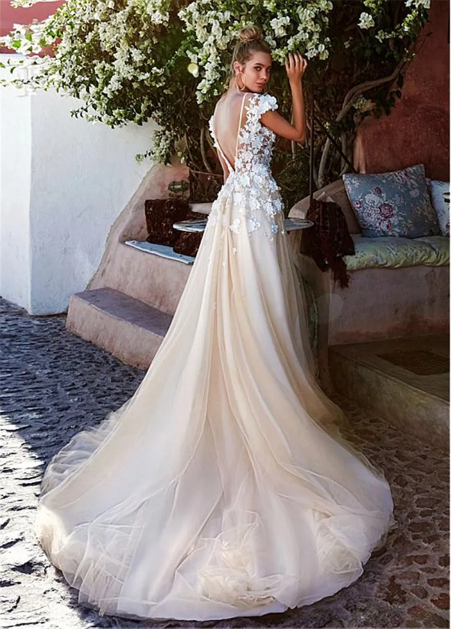 Кружевное свадебное платье-трапеция с глубоким круглым вырезом и аппликацией, свадебные платья из тюля с открытой спиной, длинные рукава с 3d-цветами, украшенные