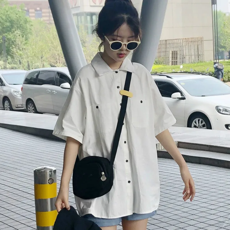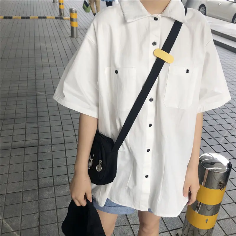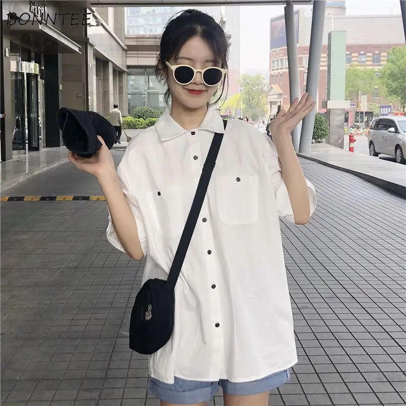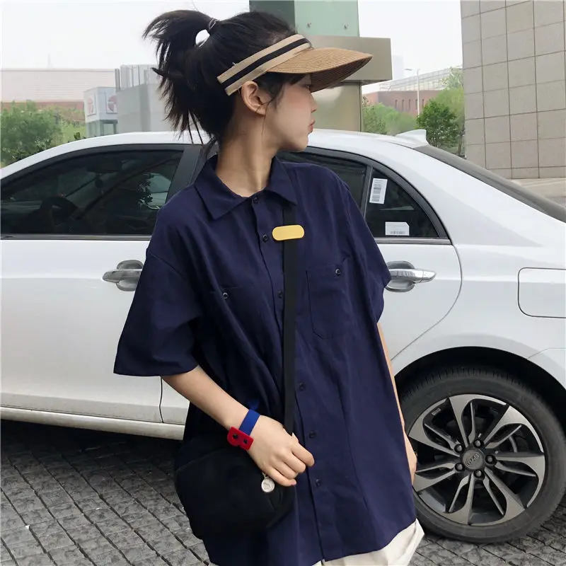 Женские рубашки в стиле ретро Харадзюку, простые, подростковые, унисекс, свободные, парные, в японском стиле с коротким рукавом, в стиле преппи, повседневные, модные, однотонные, милые