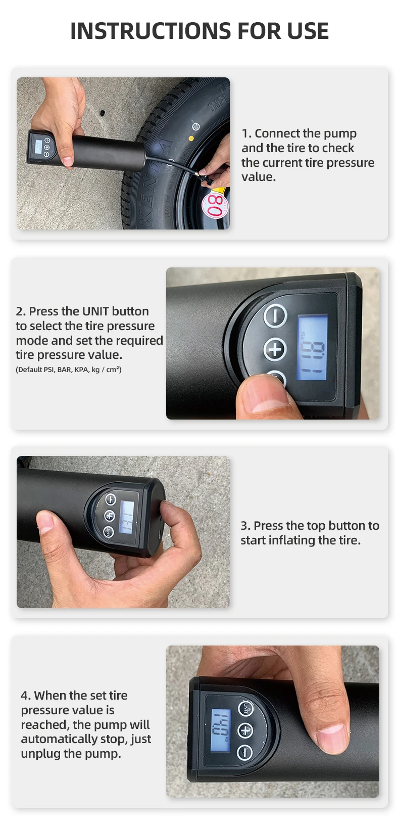 1. Подключите шланг к нижней сердцевина клапана шины.2. Нажмите на пряжку воздушного шланга, чтобы предотвратить утечку воздуха.3. Нажмите кнопку «блок», чтобы включить ЖК-экран.4. Нажмите кнопку «+» и «-», чтобы установить шиномонтаж.5. Нажмите кнопку питания, чтобы начать накачивание, она прекратится автоматически, когда заданный пресс будет достигнут.