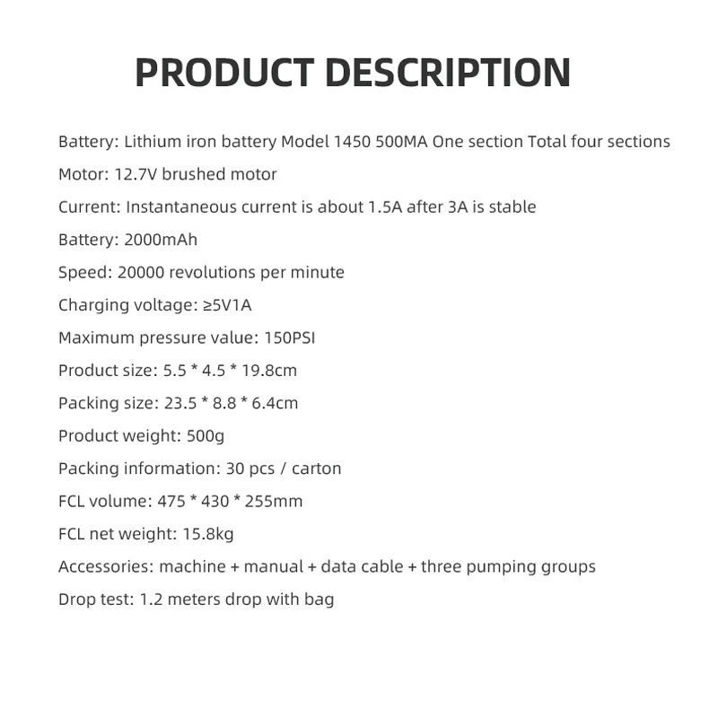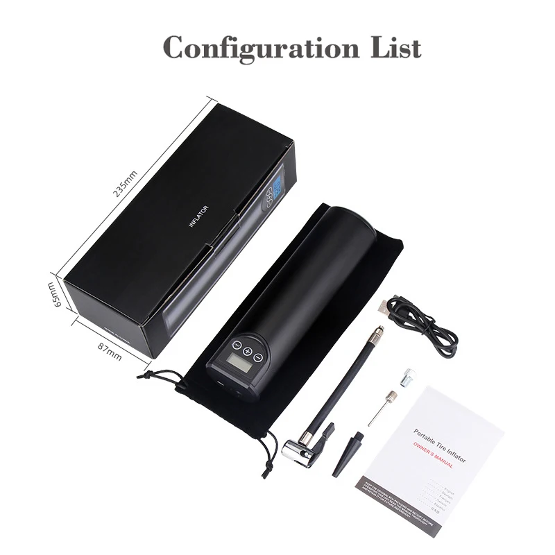 ● Перезаряжаемая батарея большой емкости: с 2000 мАч сертифицированным литий-ионным аккумулятором, этот портативный компрессор готов надуть велосипед, мяч и т. д. usb-порт для зарядки поддерживает быструю зарядку.