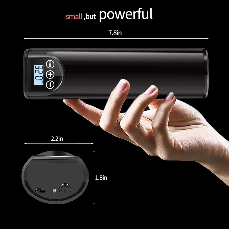 ● Беспроводной и портативный: беспроводной дизайн и компактный мини-размер делают воздушный компрессор портативным и простым в эксплуатации одной рукой. Компрессор готов всего за 4 шага. ЖК-дисплей показывает давление воздуха. Подходит для надувания, когда автомобильные шины недостаточны и полностью надуты шины для велосипедов и мотоциклов;