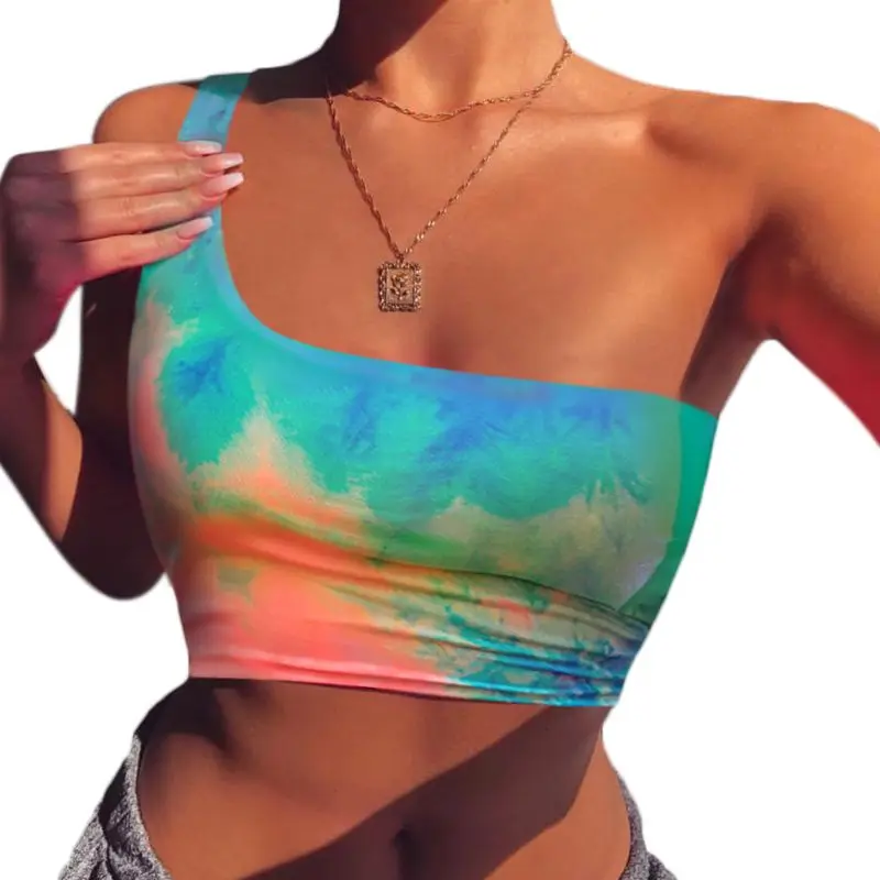 Женский пикантный укороченный топ без рукавов на одно плечо неоновый Радужный Топ бандо с завязкой тонкая майка 2020