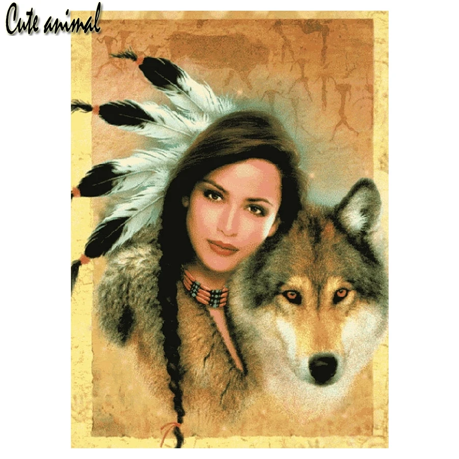 Алмазная картина 5D "сделай сам", квадратная, круглая, индийская красавица и волк, алмазная вышивка, украшение стразы, мозаика