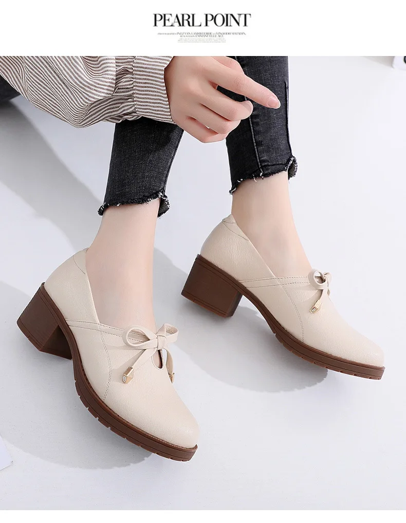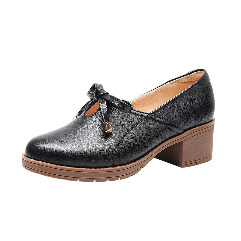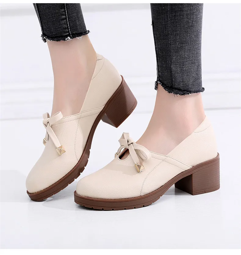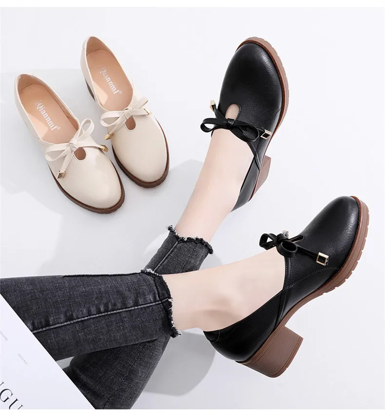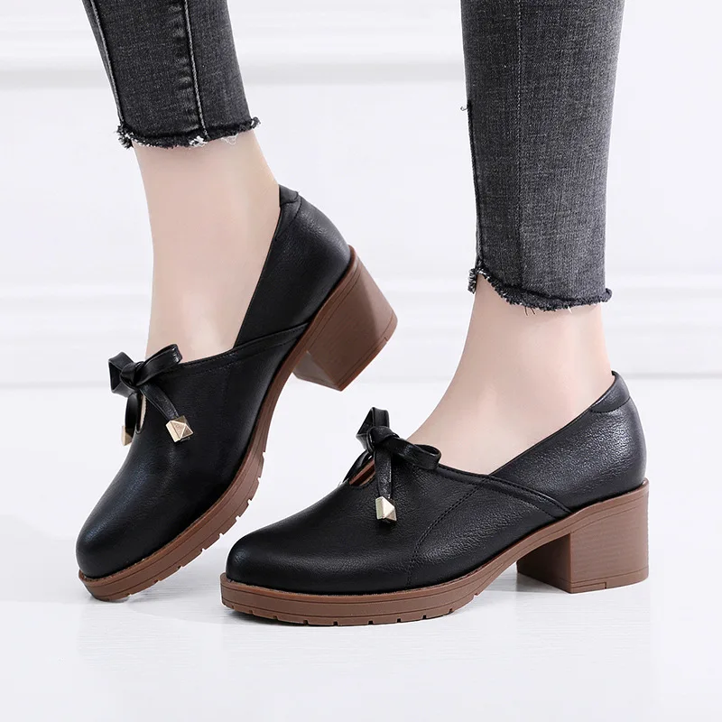 Новая женская обувь модная повседневная обувь с круглым носком, без шнуровки, с бантом-бабочкой, на квадратном каблуке, большой размер, дышащая Высококачественная нескользящая обувь из PU искусственной кожи