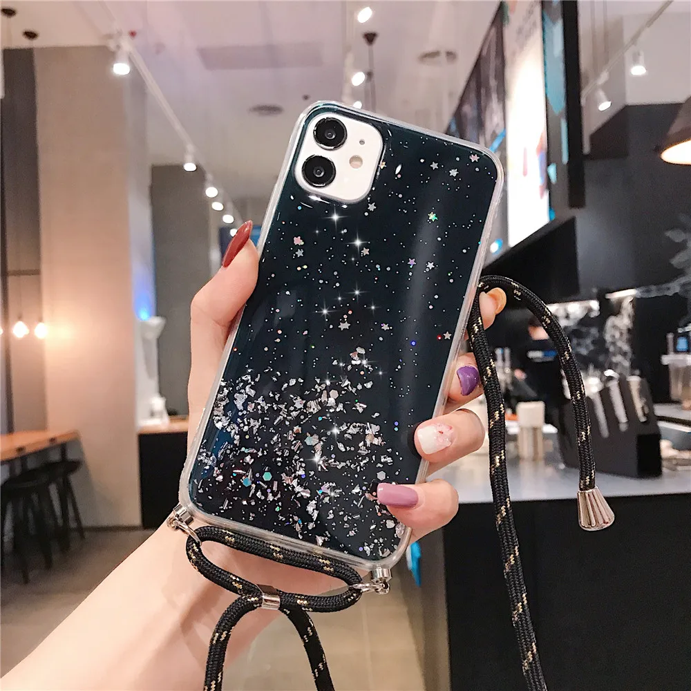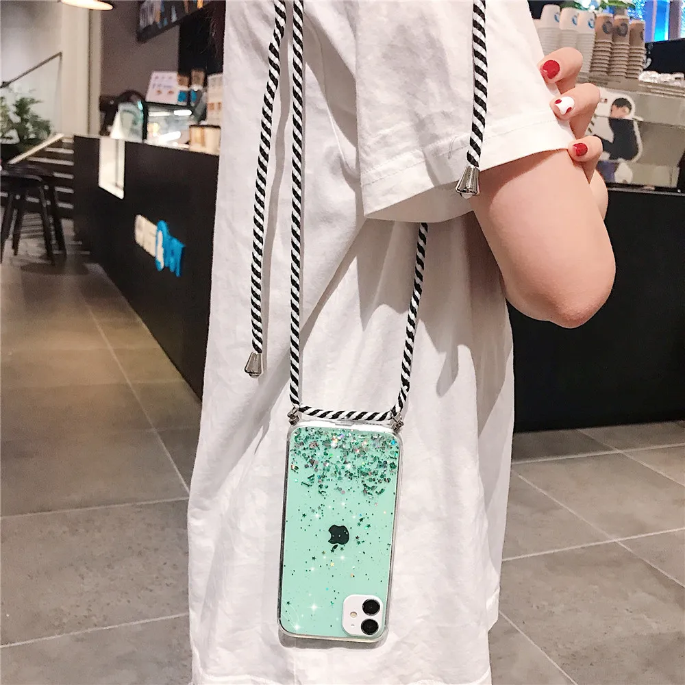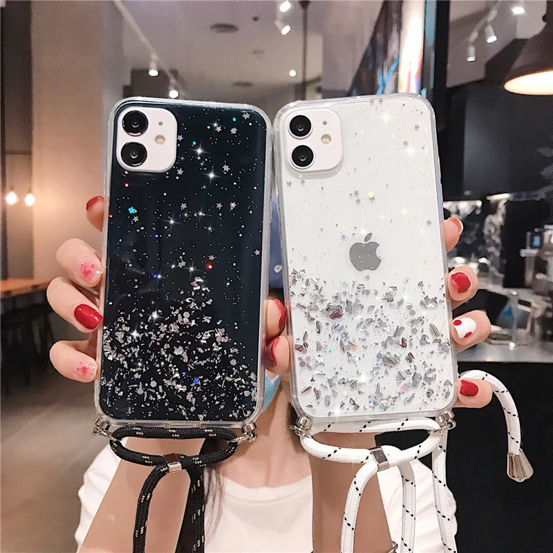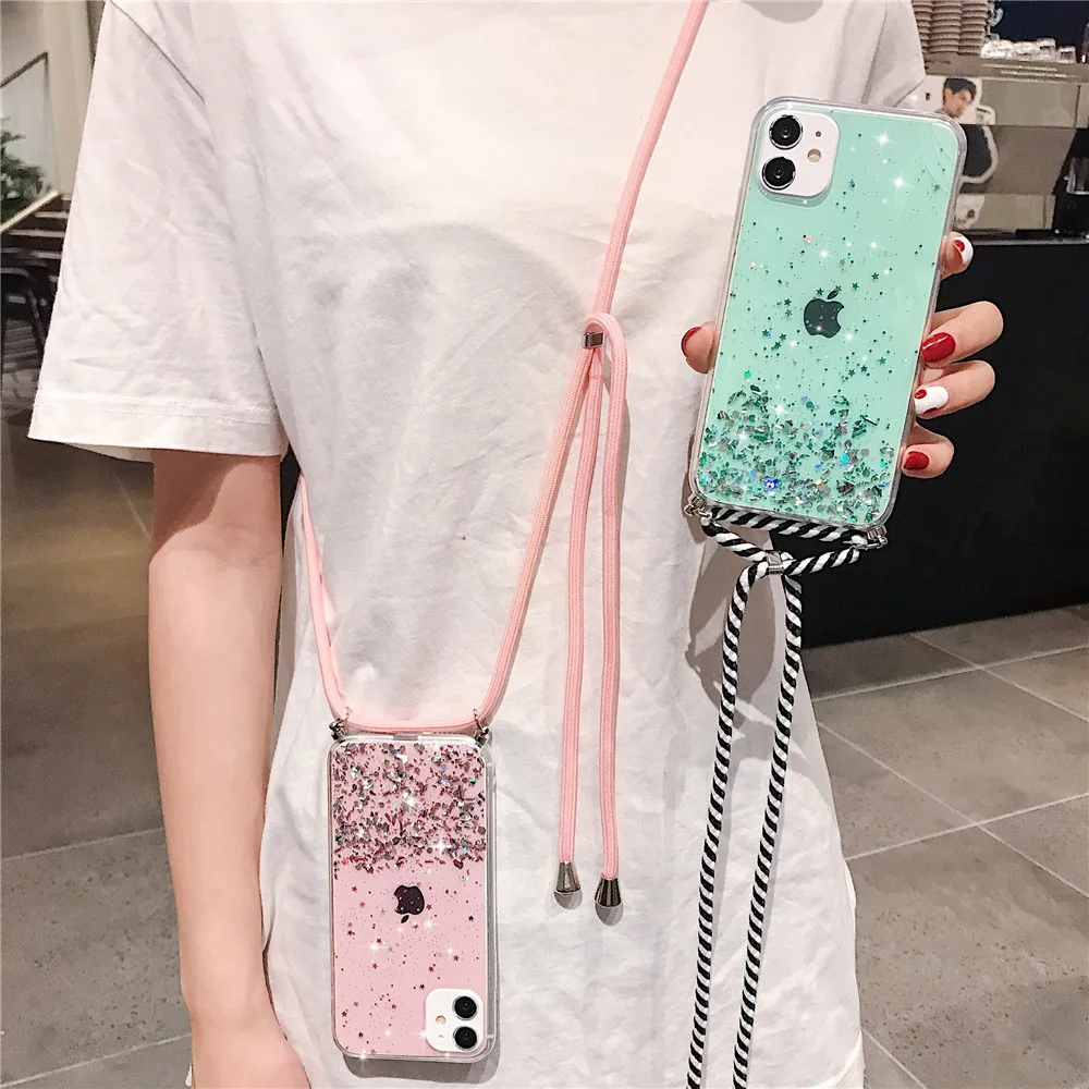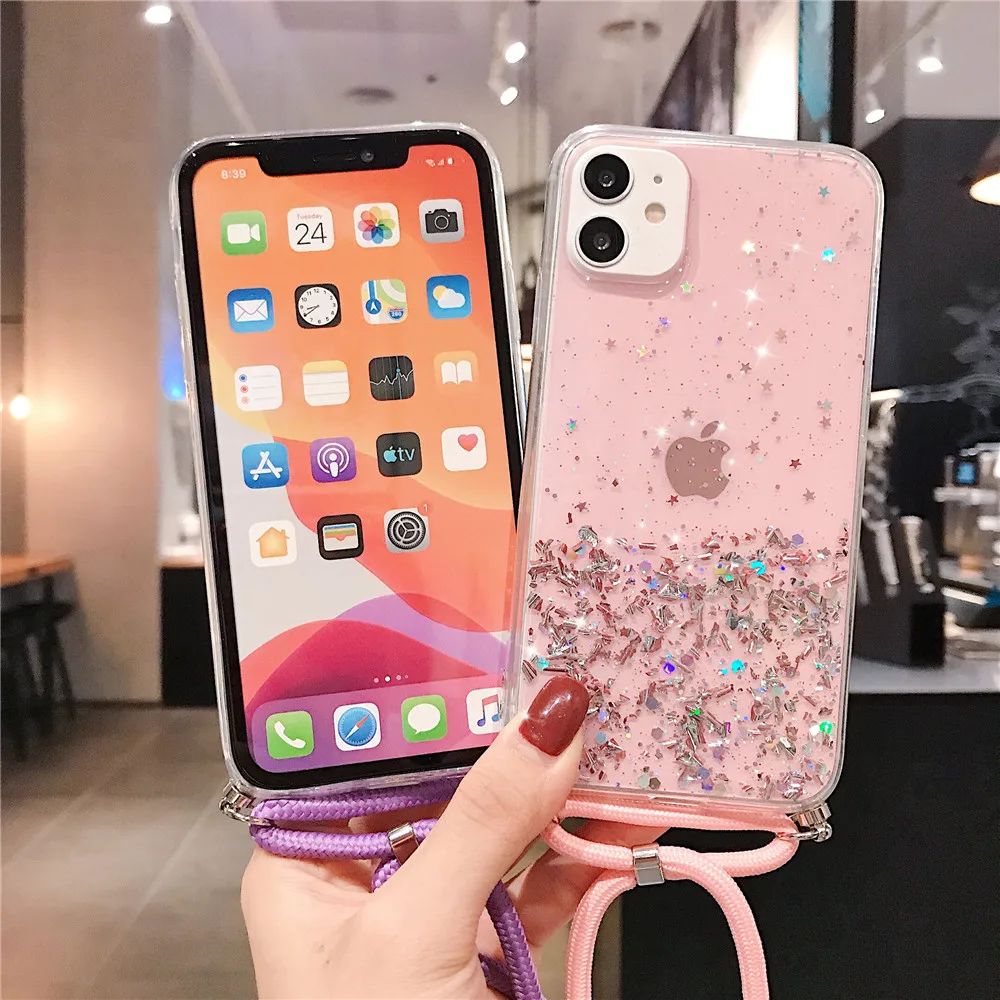 Блестящий блестящий чехол для iPhone 13 12 Mini 11 Pro XS Max XR X 7 8 6 6S Plus SE2 11 ожерелье ремешок чехол для переноски